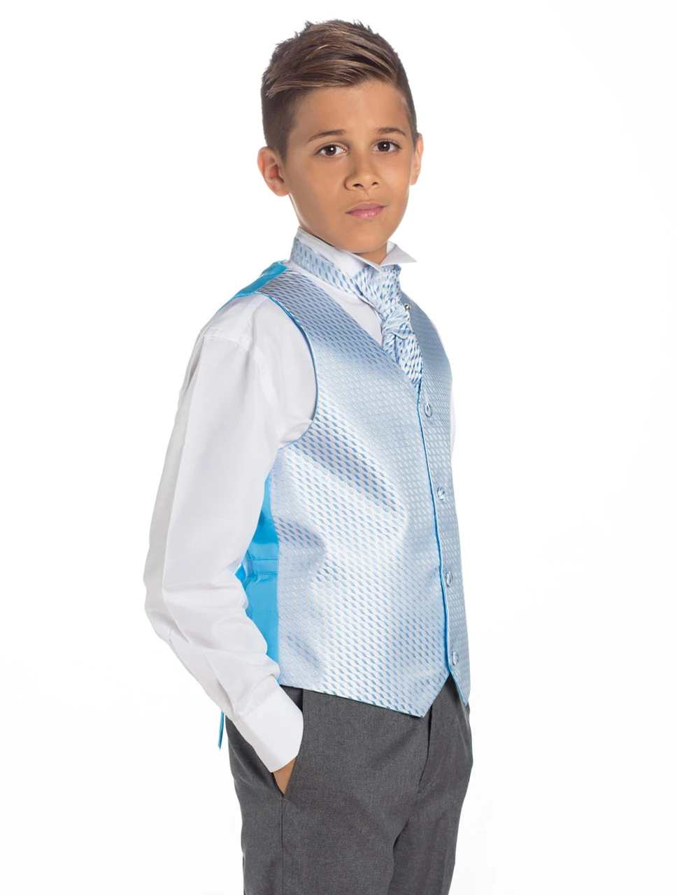 This fashionable 4 piece baby blue & grey waistcoat suit expresses a prominent impression for page boys. Brand new and exclusive from Paisley of London it is meaningfully designed with careful attention to detail using comfortable and flexible fabrics. The stunning on trend pattern waistcoat and matching cravat are elegantly complemented by the included straight bottom grey trousers and white wing collar shirt.