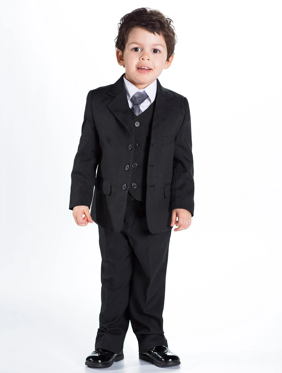 An easy choice for your growing infant; the Archie baby boys suit in black has a regular fit with elasticated waistband for comfortable wear. Featuring the full five-piece look, including jacket, trouser, waistcoat, shirt and maroon tie and hanky, the Archie is fantastic value for money and perfect for those who need an instant formal fix!