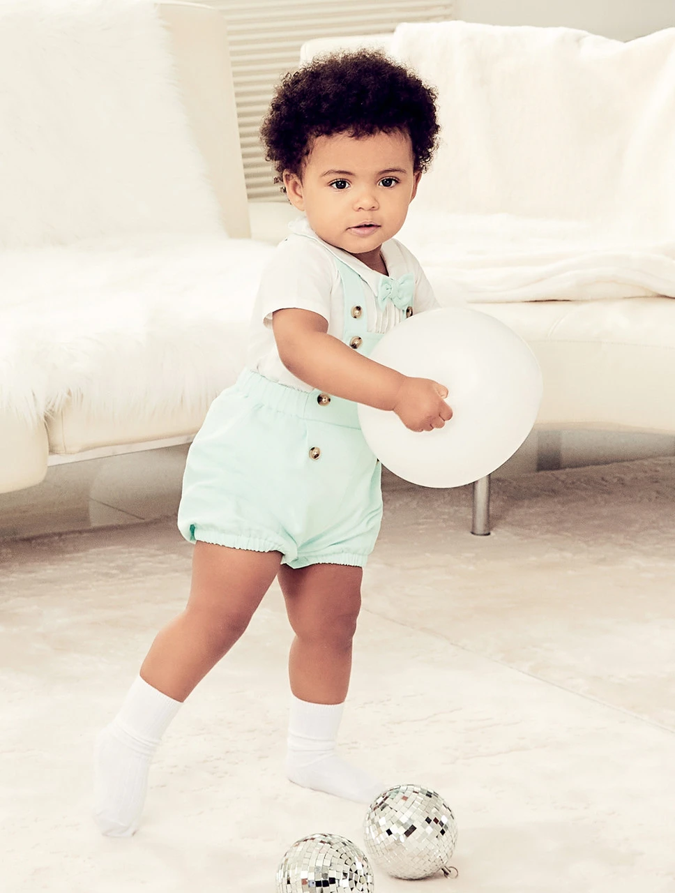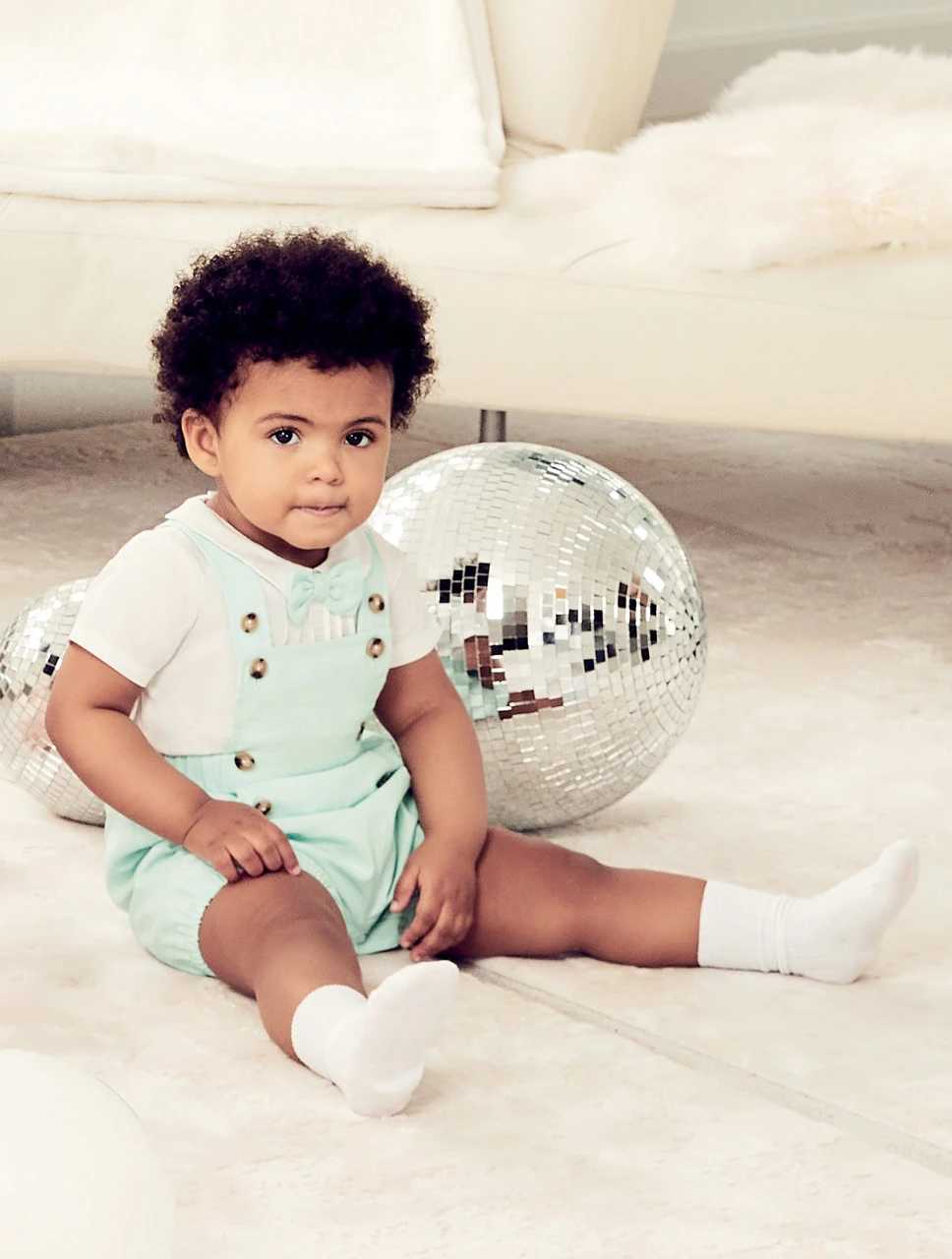 He’ll be looking as cute as can be in the Leon two-piece outfit, designed by Vogue. The lined dungarees and soft cotton mix babygrow guarantee ultimate comfort. With adjustable straps and an elasticated waistband to keep dressing convenient for those nappy changes, your little one will be all set for his special occasion.
