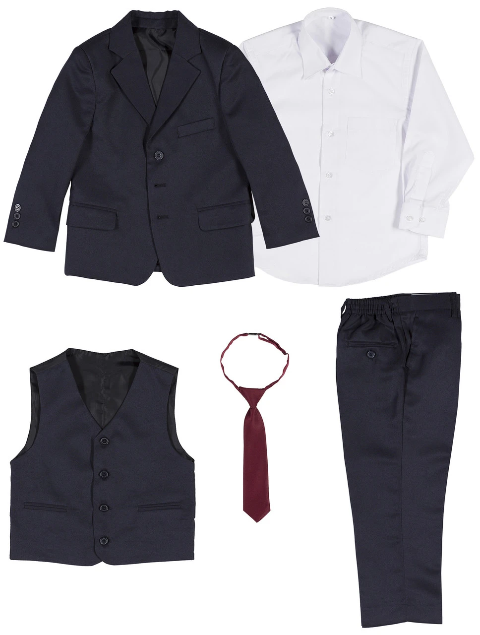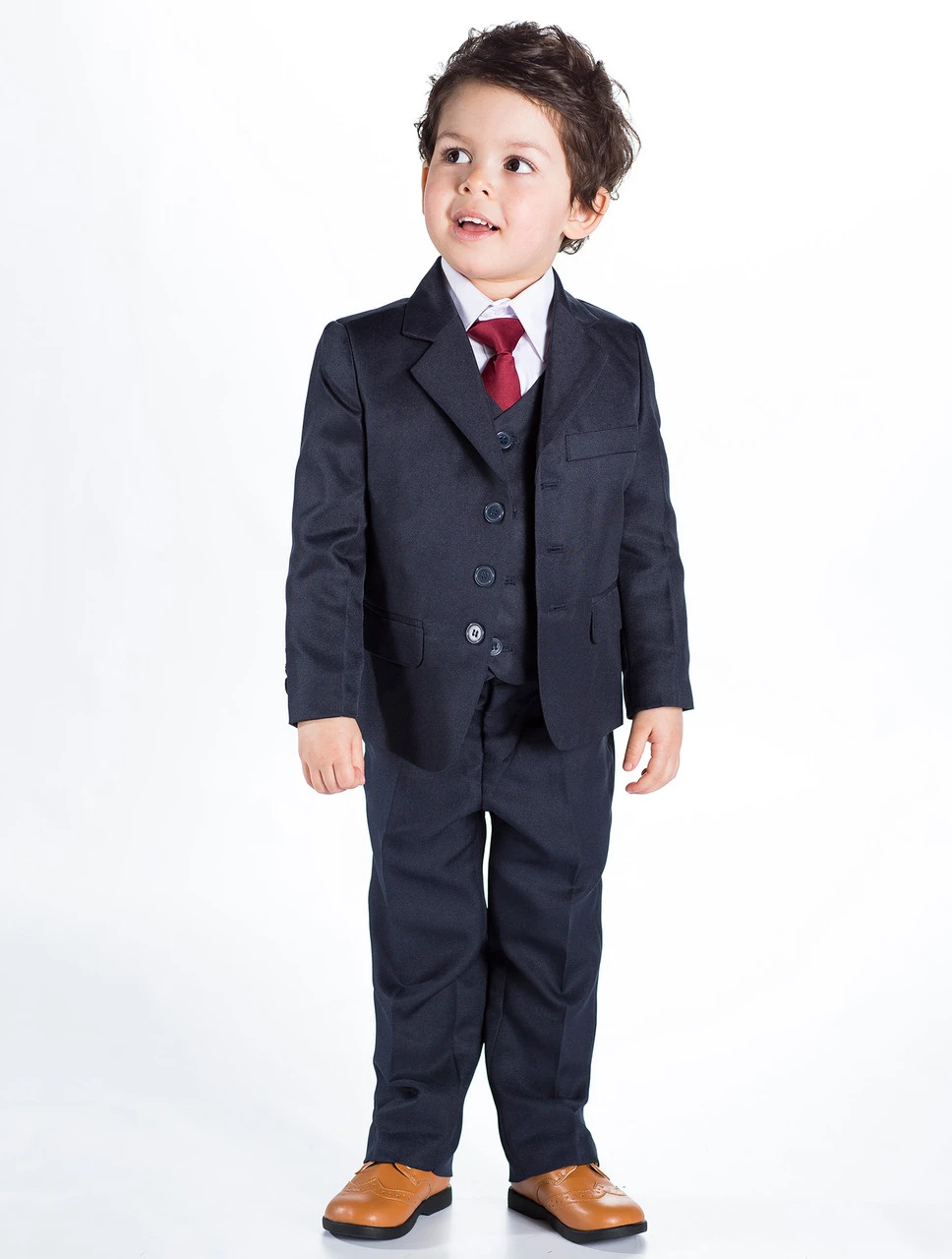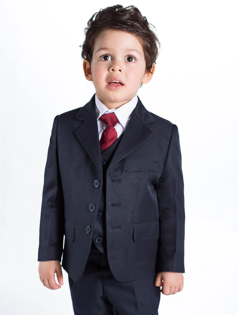 Smart dressing for those growing infants; the Archie baby boys suit in navy has a regular fit with elasticated waistband for comfortable wear. Featuring the full five-piece look, including jacket, trouser, waistcoat, shirt and maroon tie and hanky, the Archie is fantastic value for money and perfect for those who need an instant formal fix!