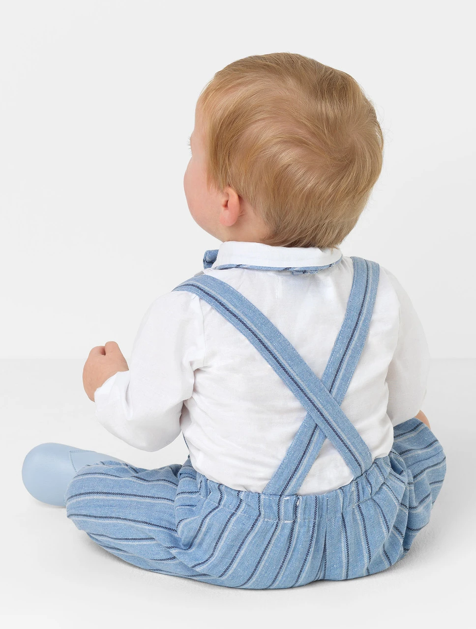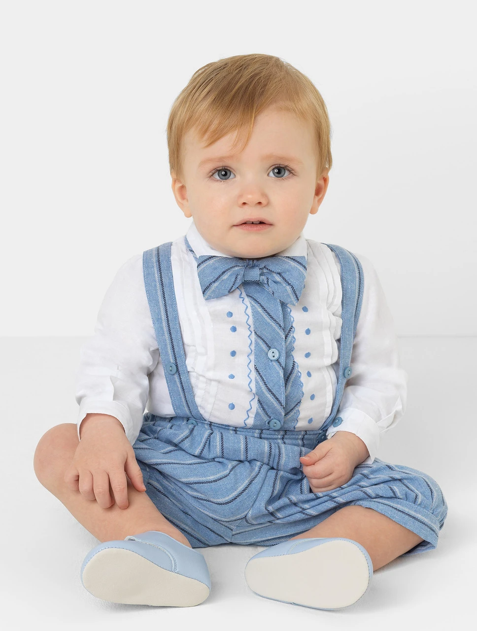 This adorable two-piece is a perfect option for your little one’s wardrobe needs. The delightful blue striped dungarees have a super soft texture for comfort, and elasticated back for easy dressing. The coordinating shirt has sweet pintuck, embroidery and button stand design detailing, has a coordinating bow tie and cap for perfect styling.