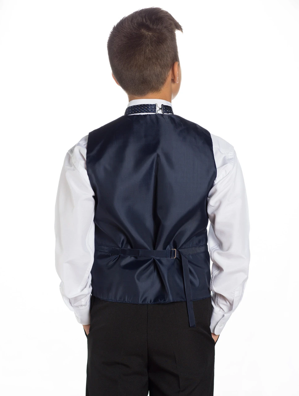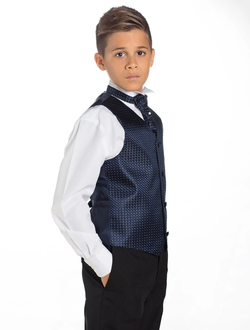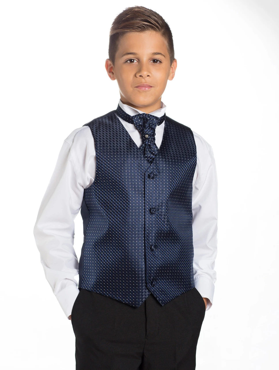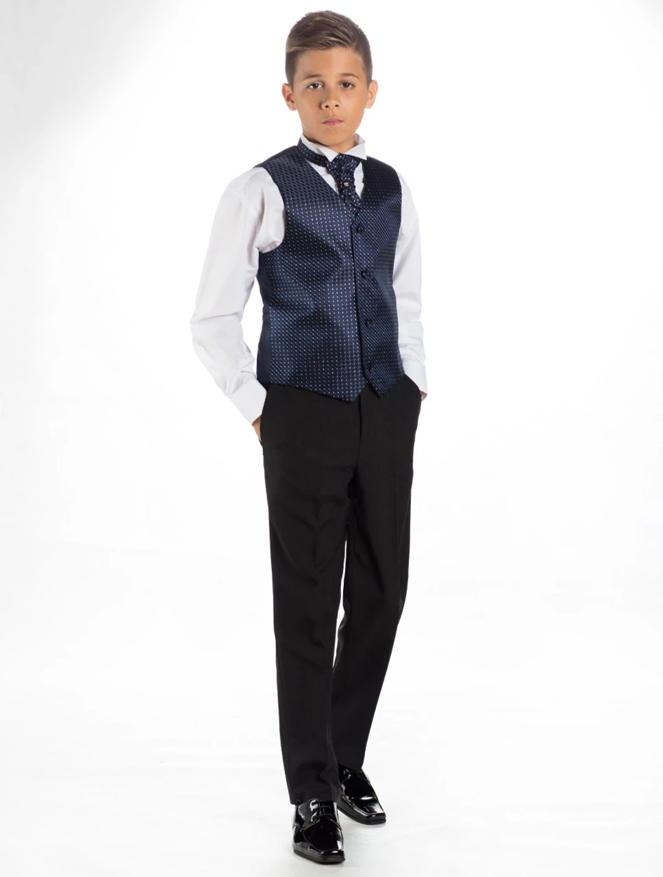 This fashionable 4 piece navy & black waistcoat suit expresses a prominent impression for page boys. Brand new and exclusive from Paisley of London it is meaningfully designed with careful attention to detail using comfortable and flexible fabrics. The stunning on trend pattern waistcoat and matching cravat are elegantly complemented by the included straight bottom black trousers and white wing collar shirt.