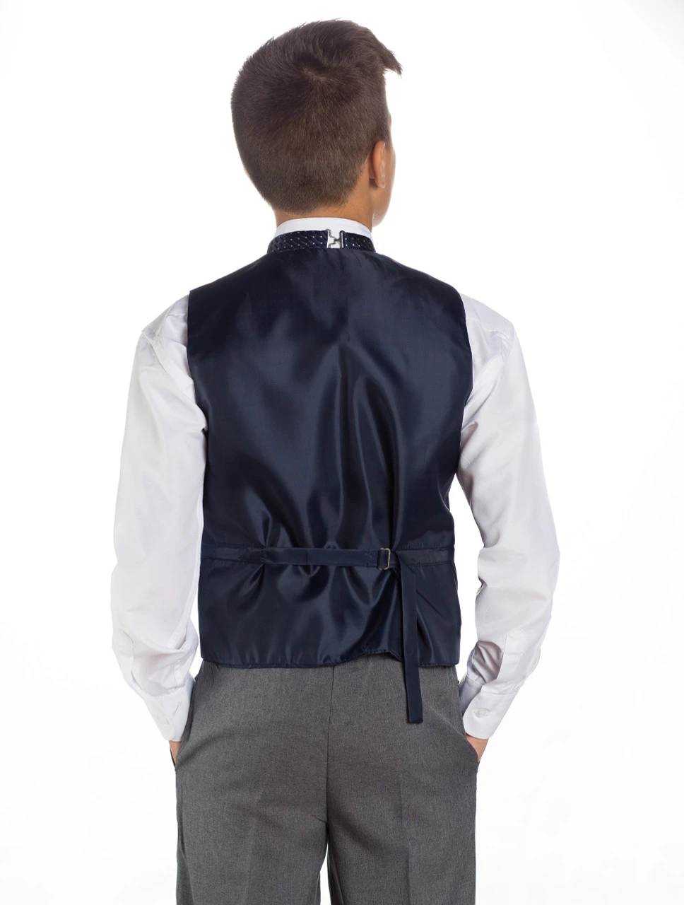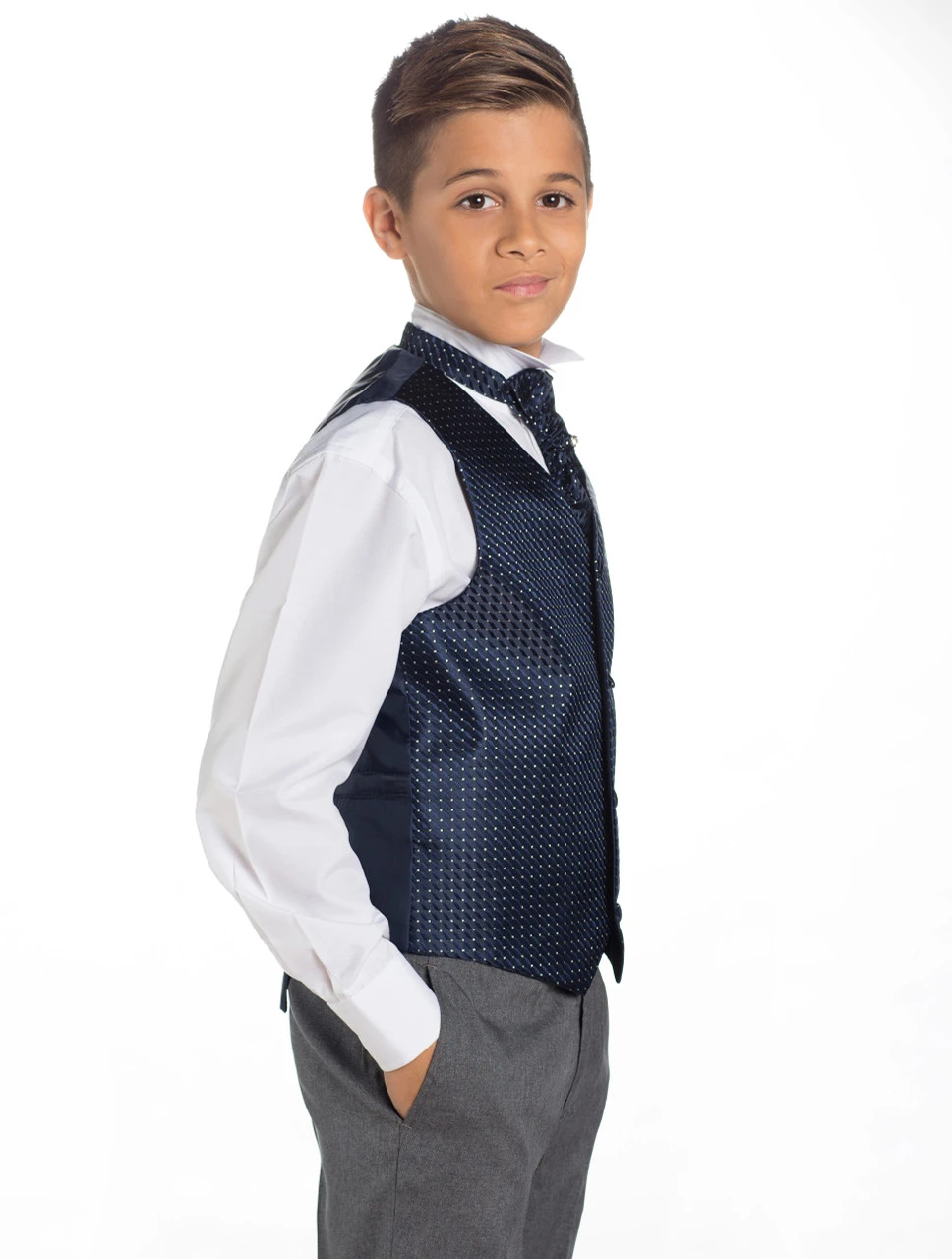 This fashionable 4 piece navy & grey waistcoat suit expresses a prominent impression for page boys. Brand new and exclusive from Paisley of London it is meaningfully designed with careful attention to detail using comfortable and flexible fabrics. The stunning on trend pattern waistcoat and matching cravat are elegantly complemented by the included straight bottom grey trousers and white wing collar shirt.