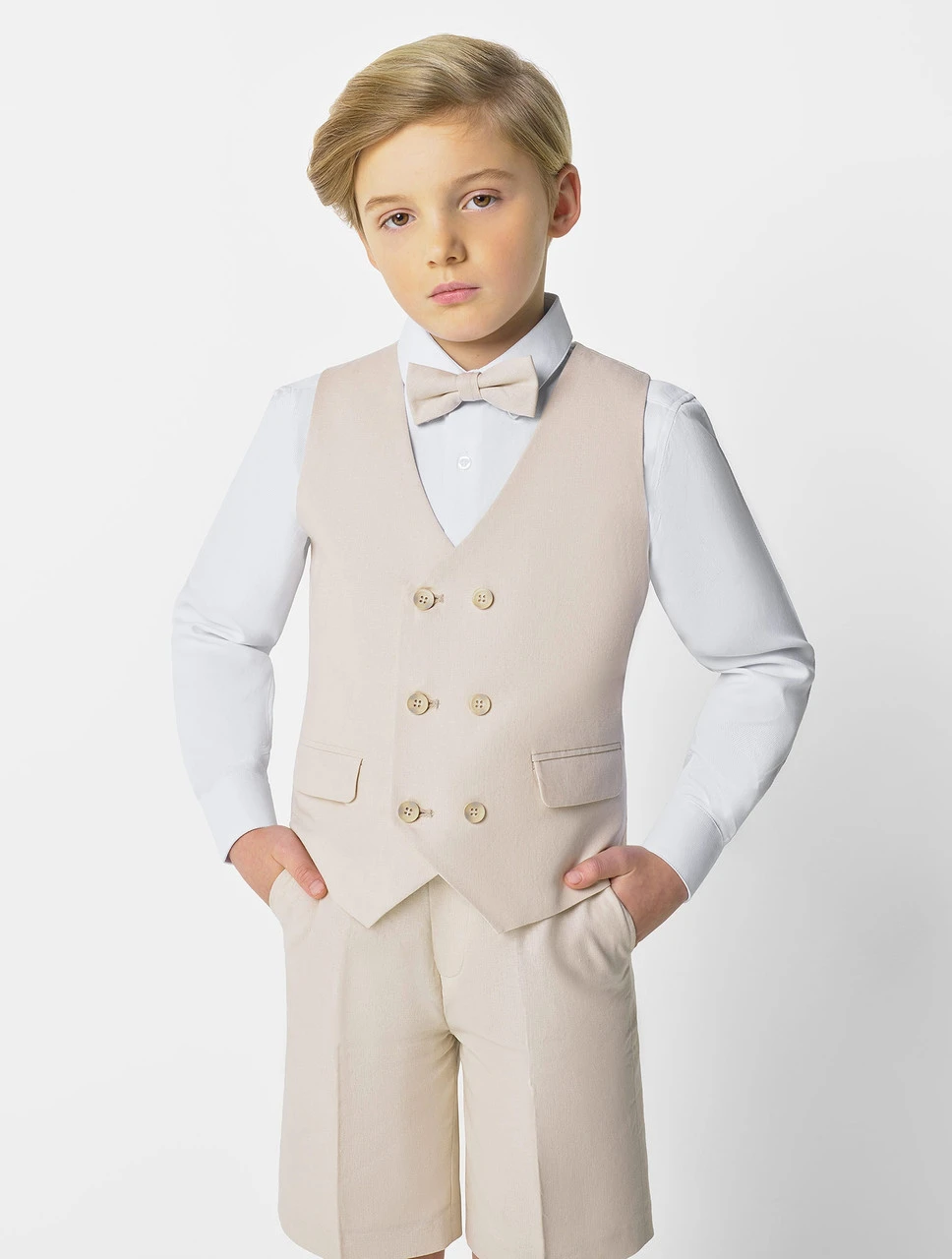 For all those warm weather events, the Harvey short suit is the outfit for him! The four-piece set includes waistcoat, short and bow tie made from linen-effect beige cloth with crisp white shirt to complete the super smart style!