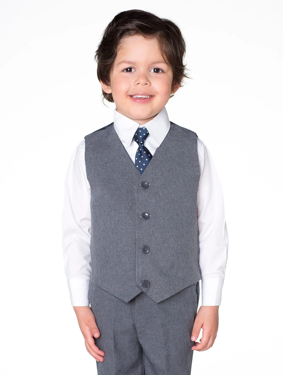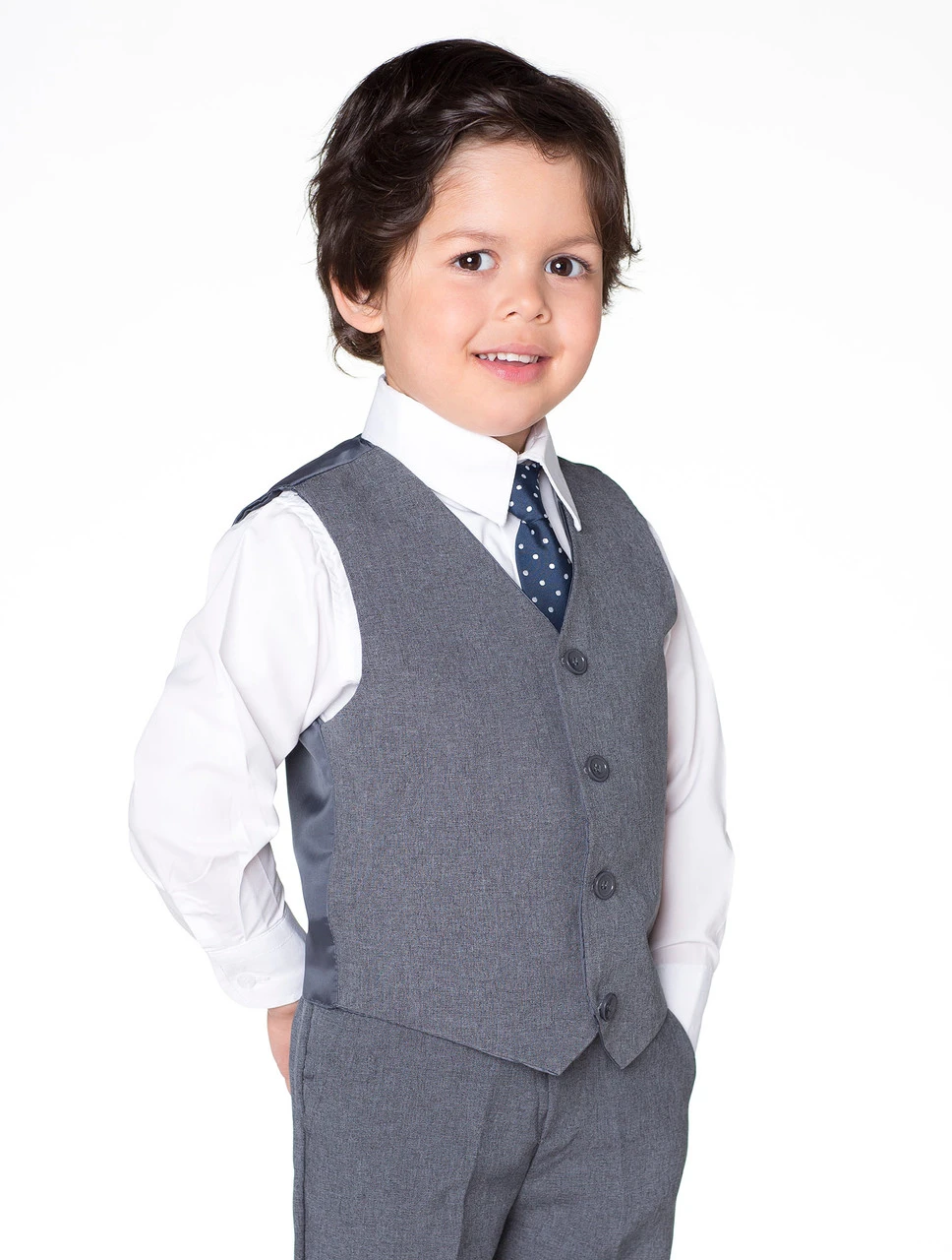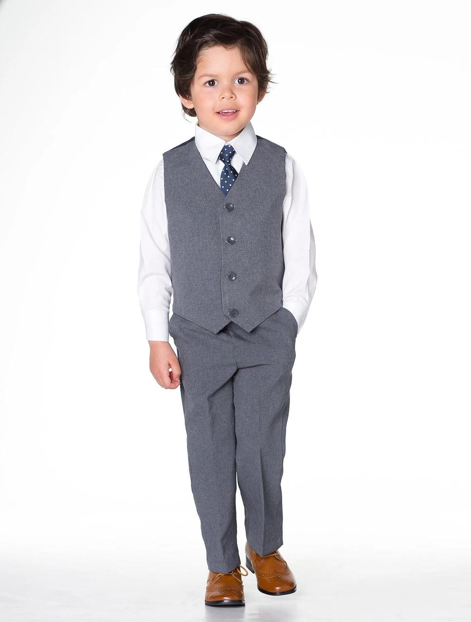 The mélange grey Bertie suit by Shiny Penny. This chic four piece suit consists of a matching waistcoat and trousers, a dazzling white shirt and navy spotted tie. A handsome four-piece option for younger children.
