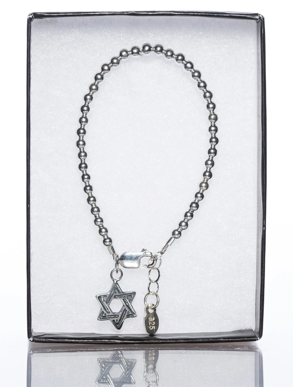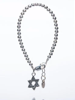 An adorable bracelet made up of small sterling silver beads and completed with a quaint Star of David charm. Size small – 0-12 months Size medium – 1-5 years Size large – 5-13 years Please note due to this item being children’s jewellery, it may appear smaller when you receive it than it looks on the picture. boys star of david