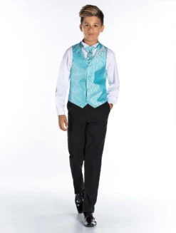 This fashionable 4 piece waistcoat suit expresses a charming impression for page boys. Brand new and exclusive from Paisley of London it is significantly designed with careful attention to detail using comfortable and flexible fabrics. The stunning swirl pattern waistcoat and matching cravat are elegantly complemented by the included straight bottom grey trousers and white wing collar shirt.