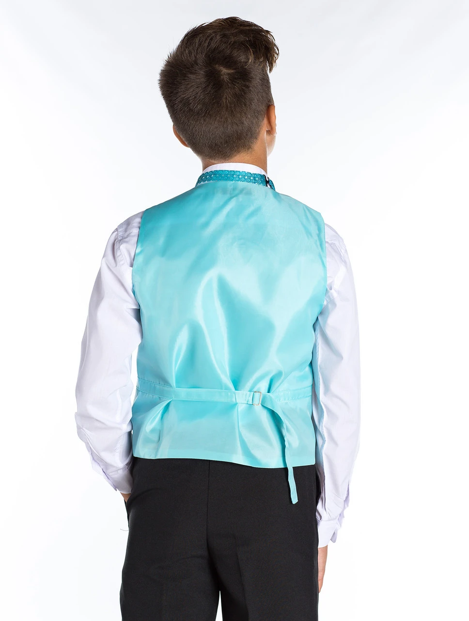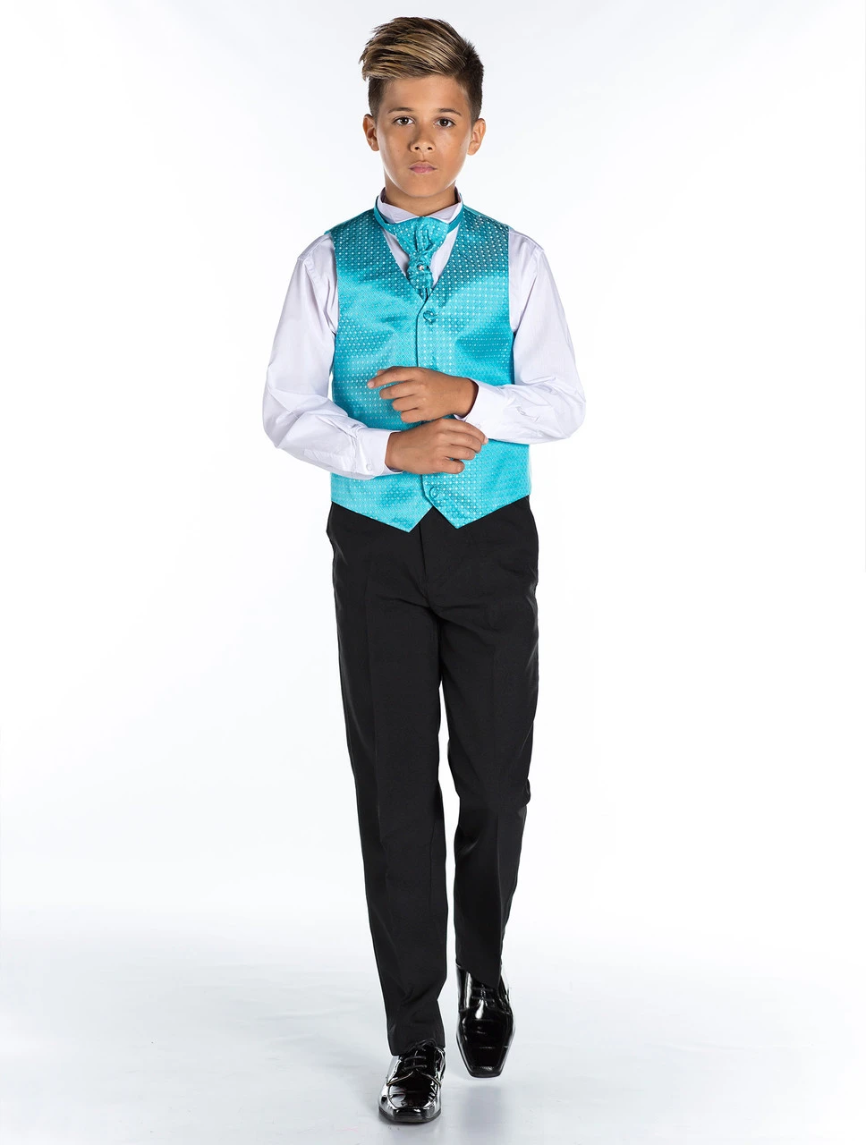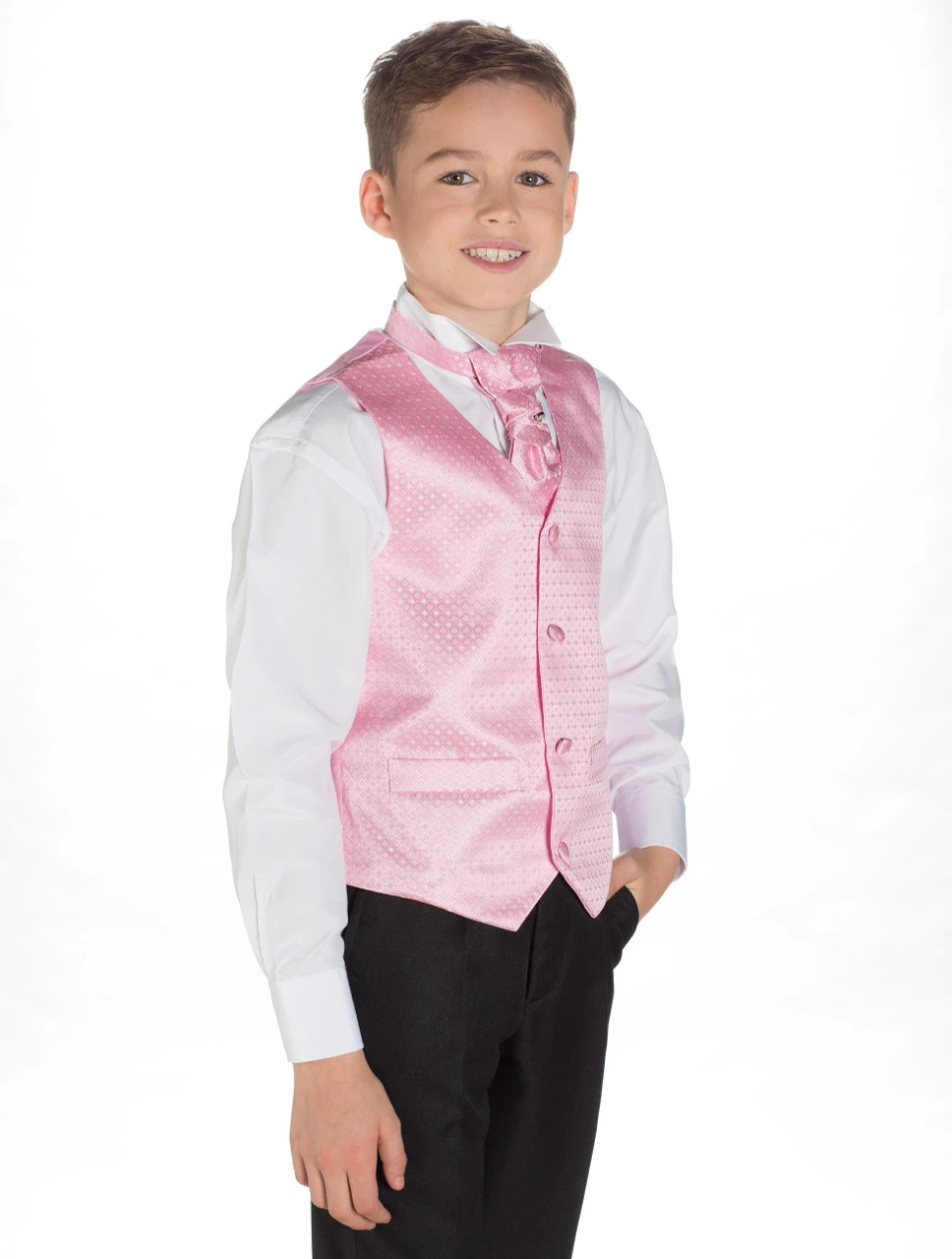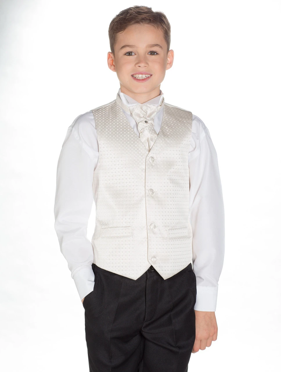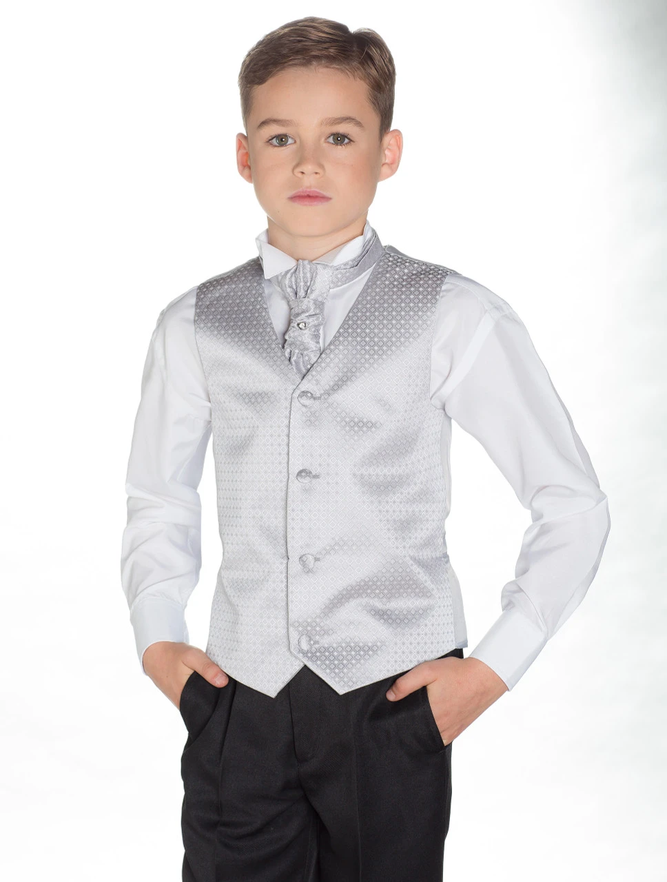 Boys stunning 4 piece waistcoat suit, ideal for a striking impression for page boys. Exclusive from Paisley of London it is significantly designed with careful attention to detail using comfortable and flexible fabrics. The charming diamond pattern waistcoat and matching cravat are elegantly complemented by the included straight bottom black trousers and white wing collar shirt.