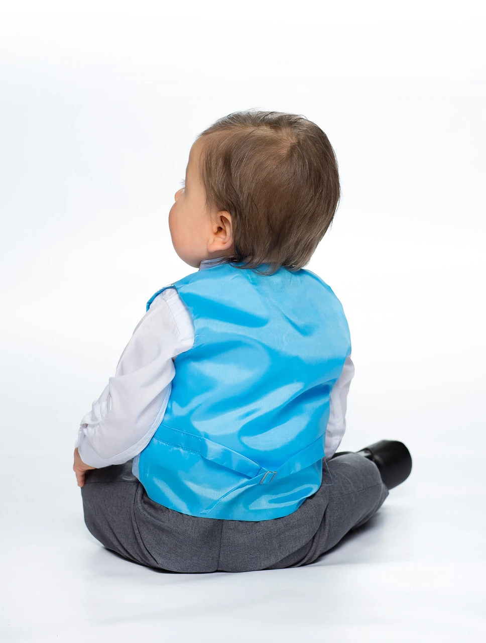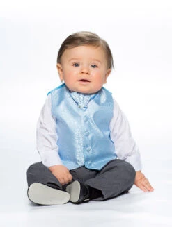 This fashionable 4 piece baby blue waistcoat suit expresses a striking impression for page boys. Exclusive from Paisley of London it is significantly designed with careful attention to detail using comfortable and flexible fabrics. The stunning swirl pattern waistcoat and matching cravat are elegantly complemented by the included straight bottom grey trousers and white wing collar shirt.