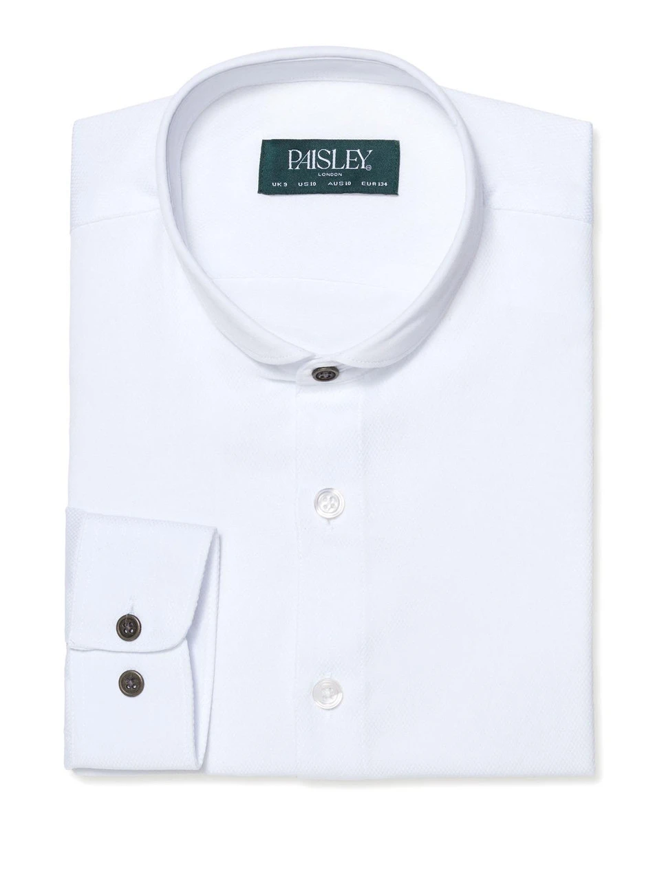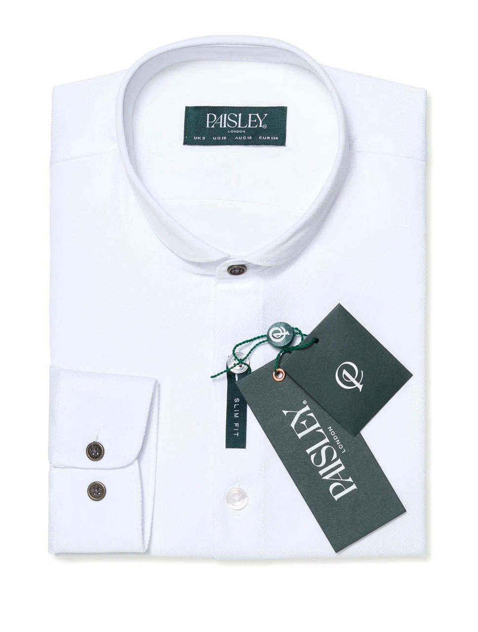 Look sharp in this crisp white long sleeved penny collar shirt by Paisley of London. This sophisticated white shirt features gunmetal buttons to the collar and cuff to stand out from the crowd.