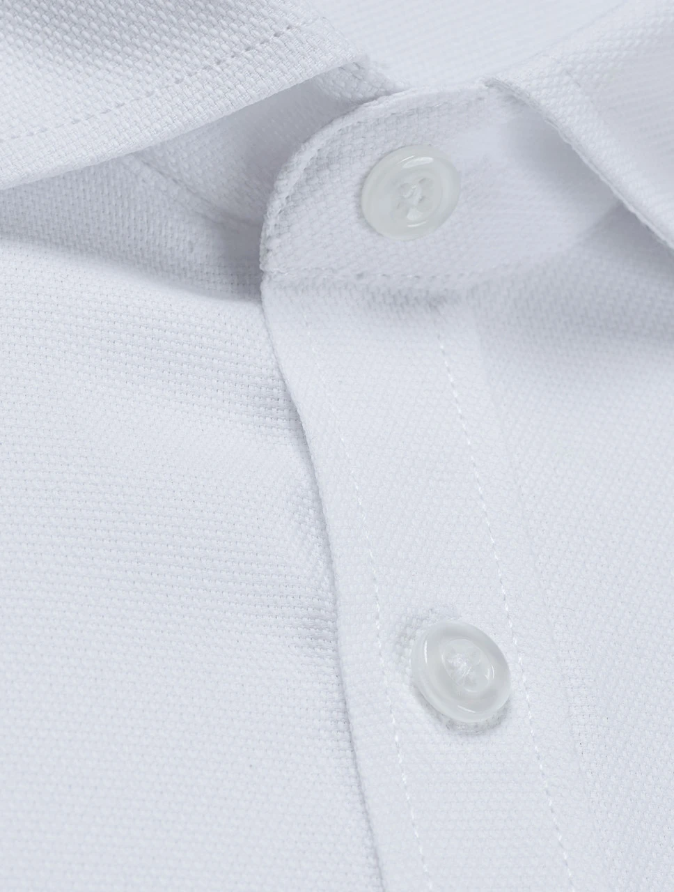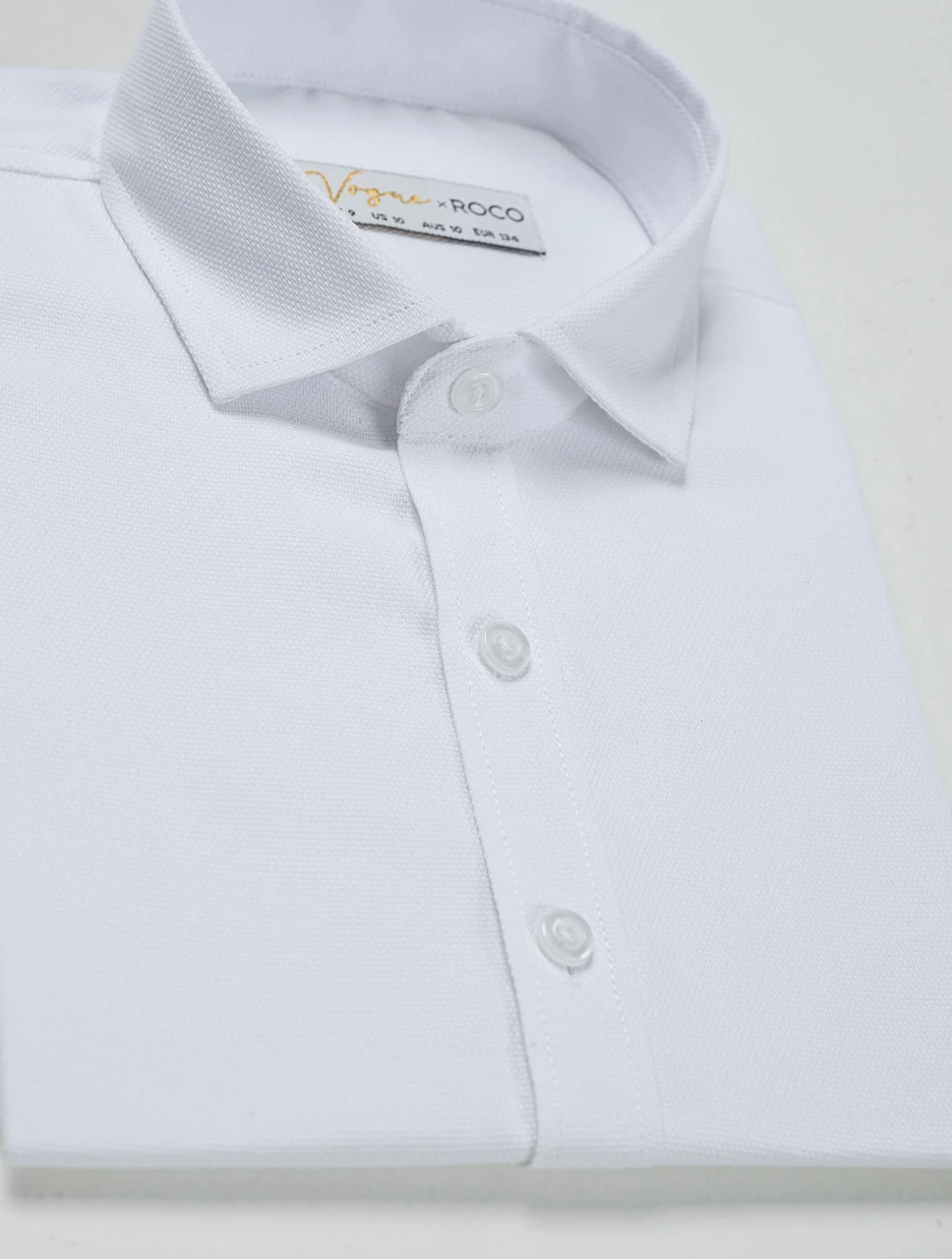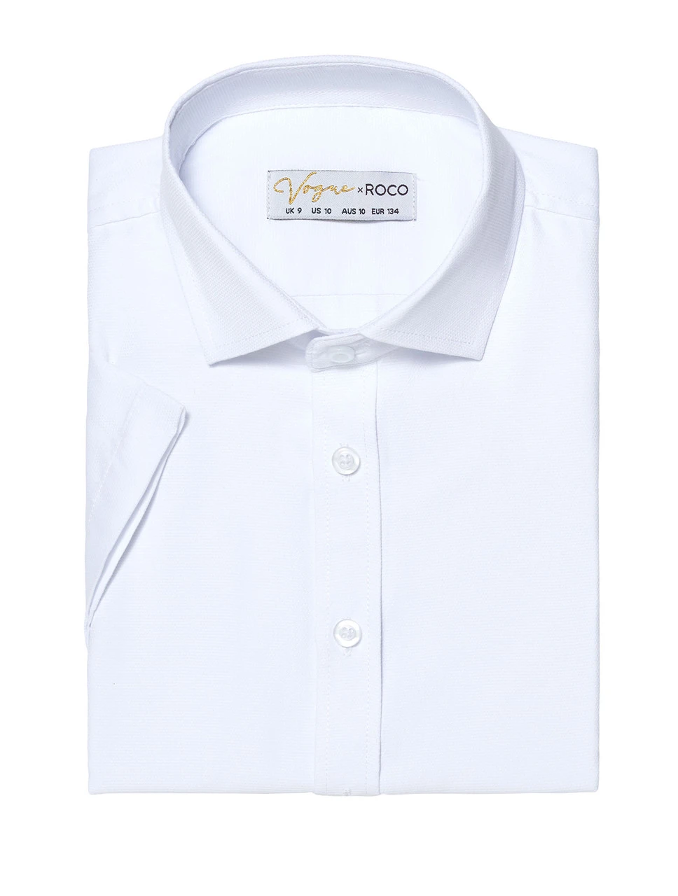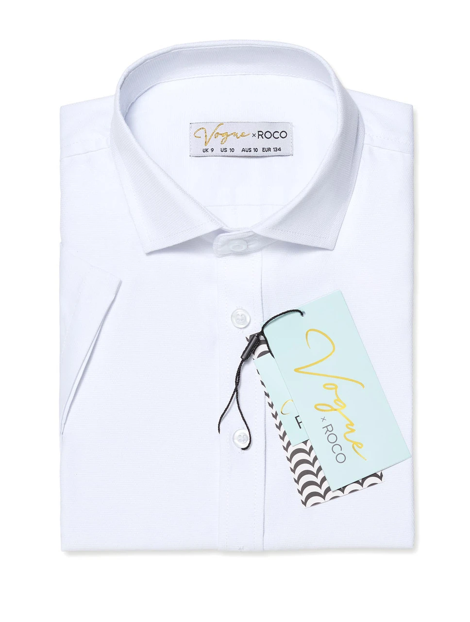 Look sharp in this standard collar white short sleeved shirt. As part of the VogueXRoco collection this shirt perfectly compliments the on-trend boys suits designed by Vogue Williams.