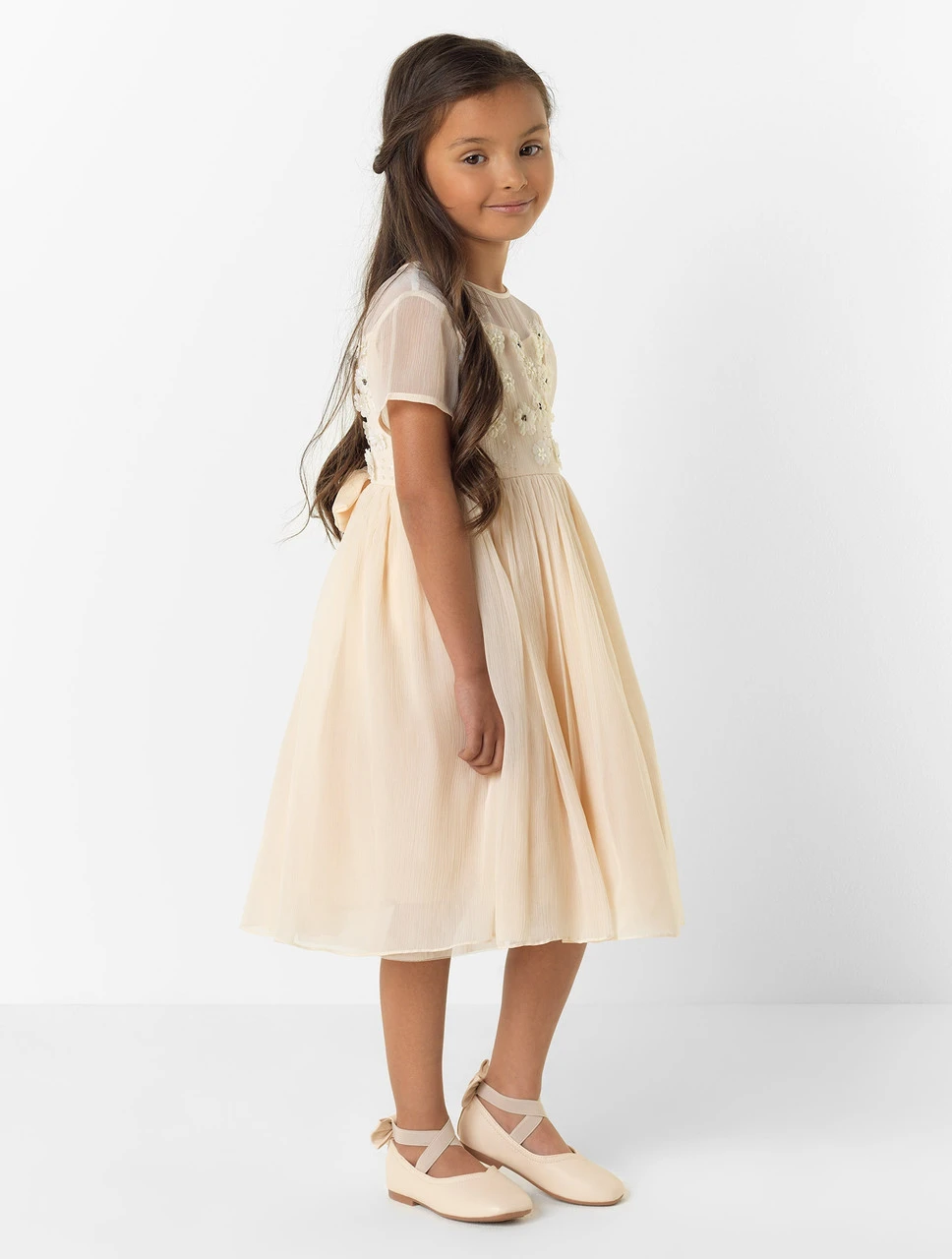 Hers to treasure, the Florence dress is a beautiful choice for any wedding, party or special occasion. Designed by artisan specialists, the floral embellishment is hand-crafted for added luxury. Made from delicate crepe, the blush style has a sweetheart neckline for your own sweetheart girl.