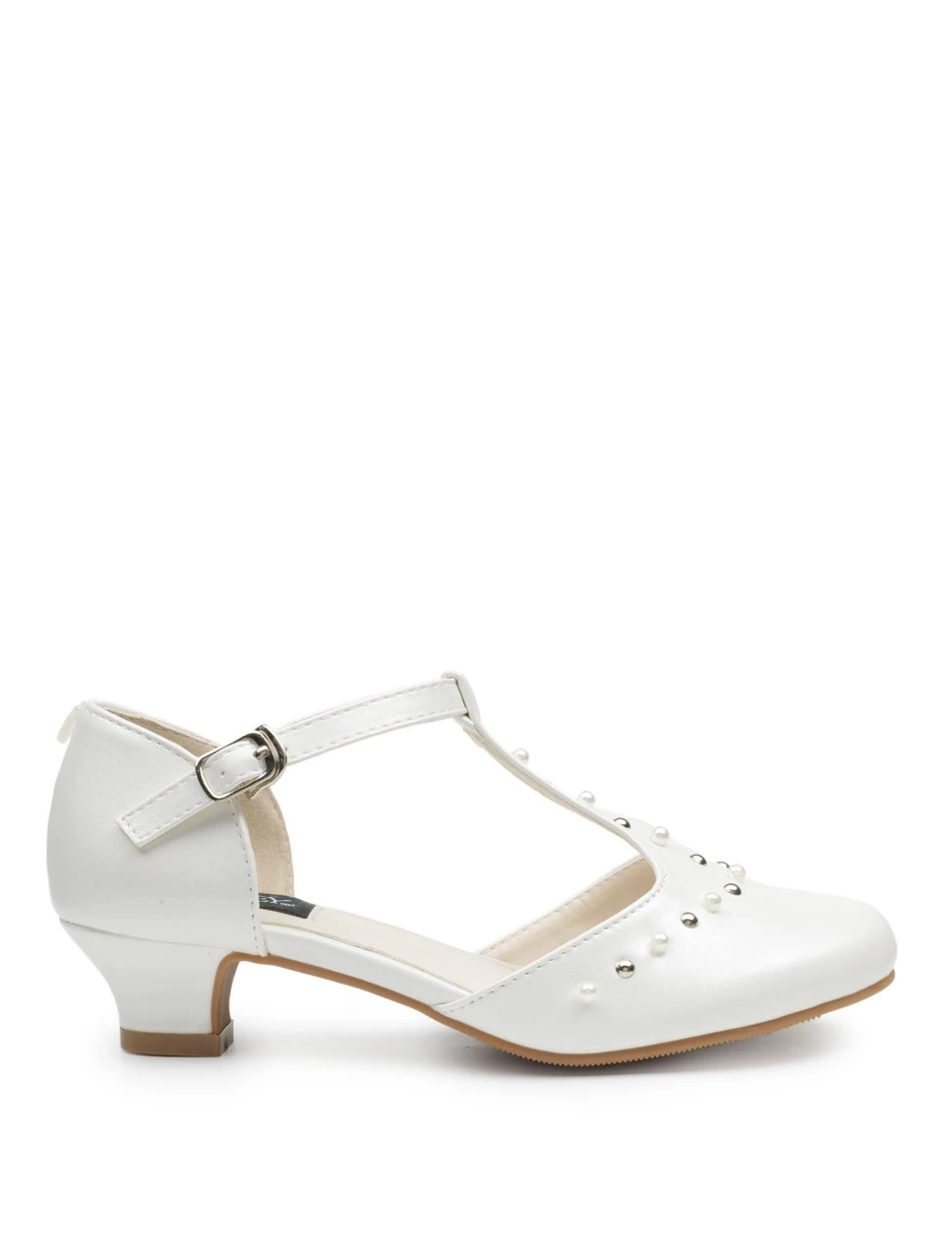Be one step ahead of style with the Freesia shoe. Perfect for any party, communion or special occasion, the unique by Paisley of London design combines trendy embellishment with an iconic heel silhouette for your young lady. The elegant T-bar design is decorated with pearl and stud details to suit every girl’s fashion sense! The adjustable buckle strap ensures the perfect fit, while the small heel will make your little one feel like a queen!