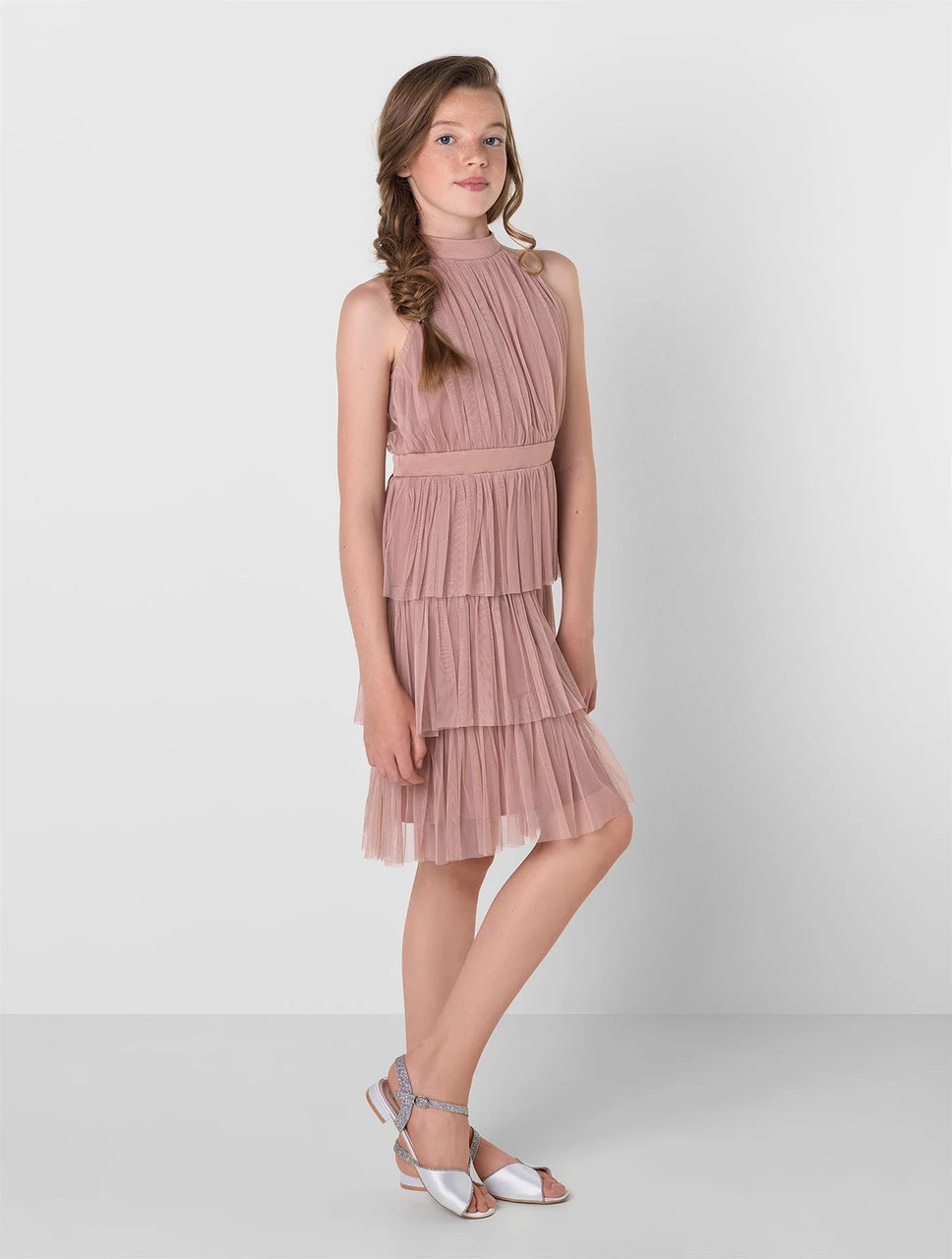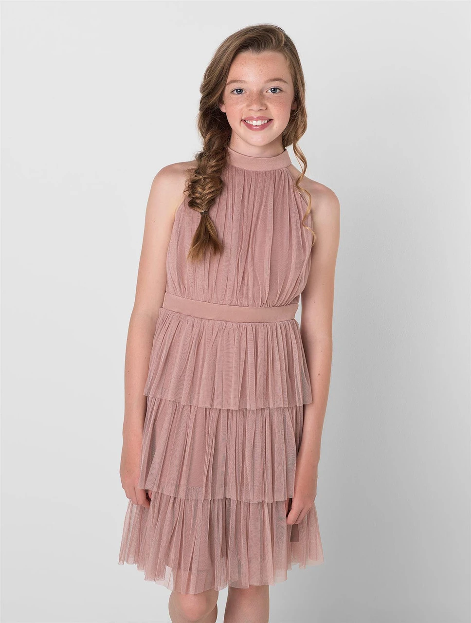 For every fashion conscious teenager the halter neck style of this pearl blush dress pairs both sophistication and style. The multi tiered styling is timeless and looks great for every occasion day to night. Back zip fastener, with neck closure and waist tie. Also available in ivory and frosted green.