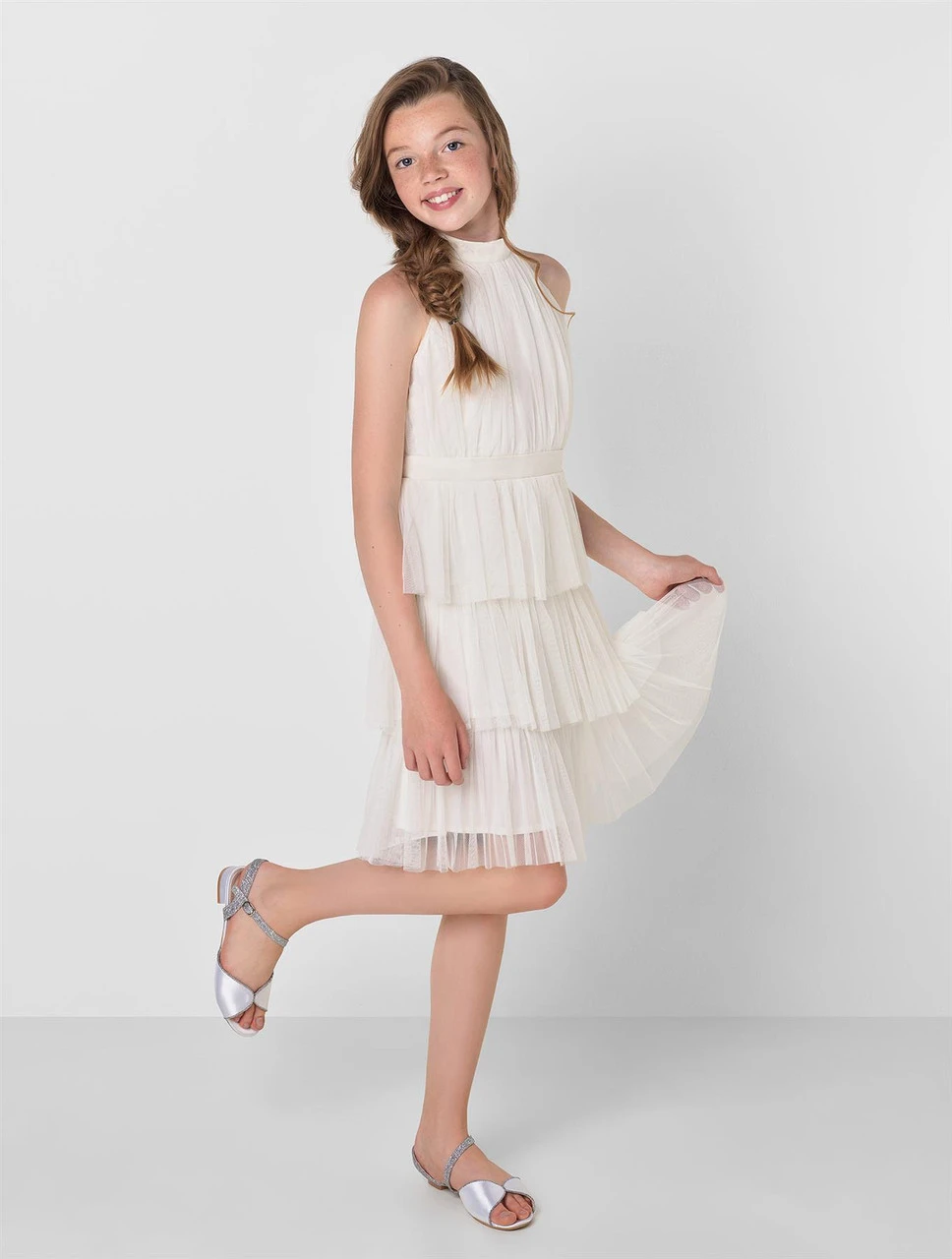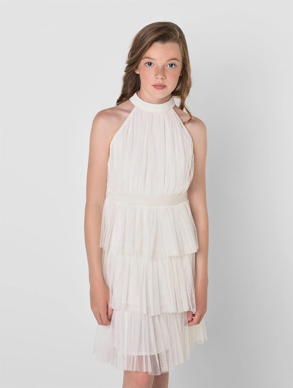 For every fashion conscious teenager the halter neck style of this ivory dress pairs both sophistication and style. The multi tiered styling is timeless and looks great for every occasion day to night. Back zip fastener, with neck closure and waist tie. Also available in pearl blush and frosted green.