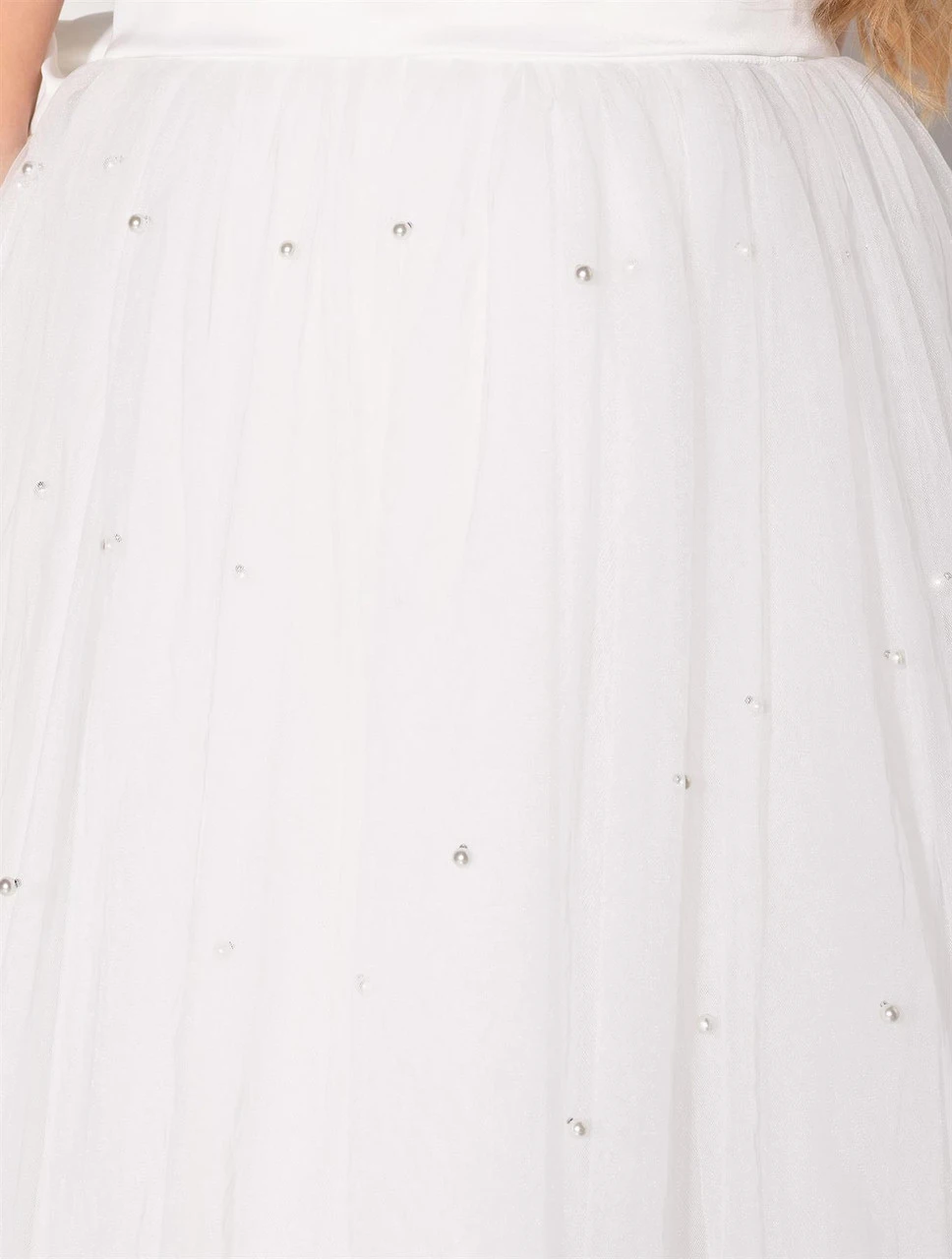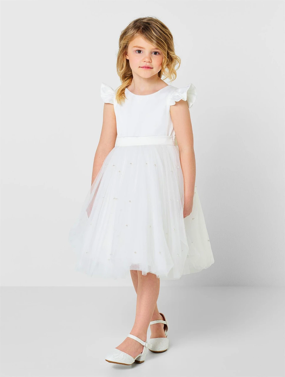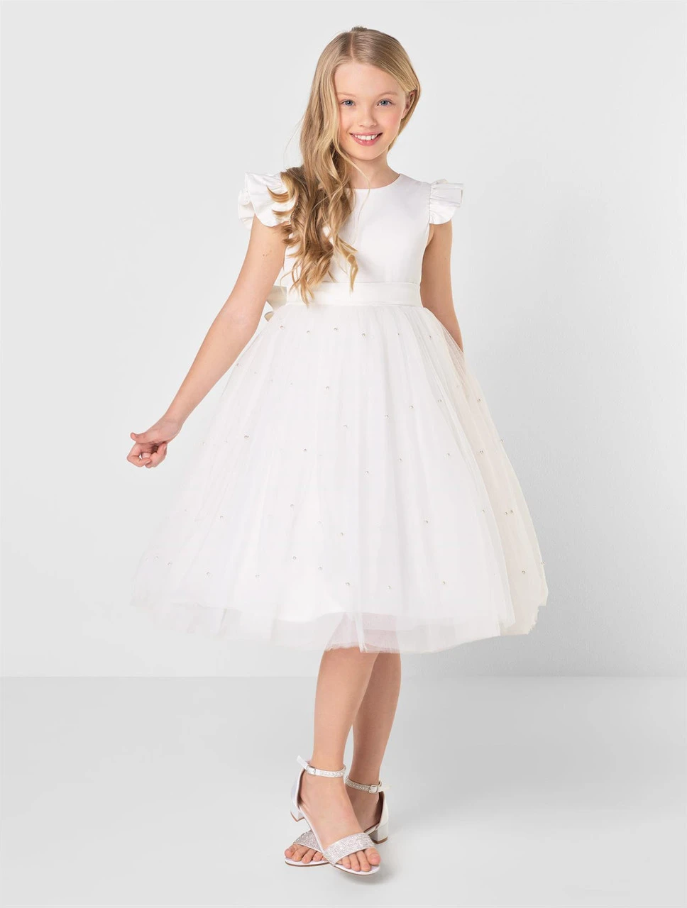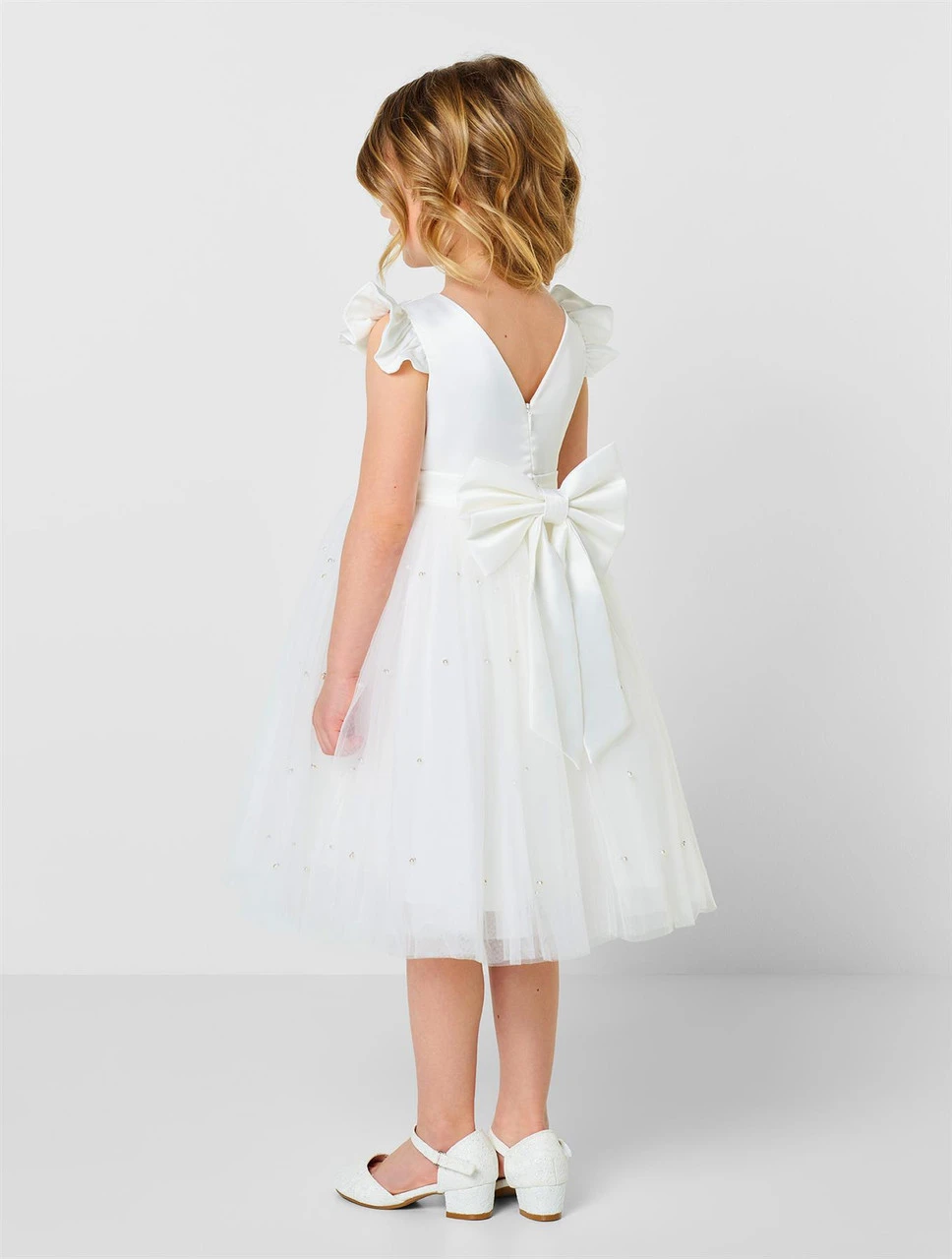 Here to melt hearts, our Rhea white dress is one of our favourites for summer occasions, christenings and communions. Featuring lovely pearl detail, on to a tulle voluminous skirt, a satin bodice with frilled shoulder and a gorgeous v-neck back with detachable bow. Perfect paired with our Kamellia ivory glitter shoes.