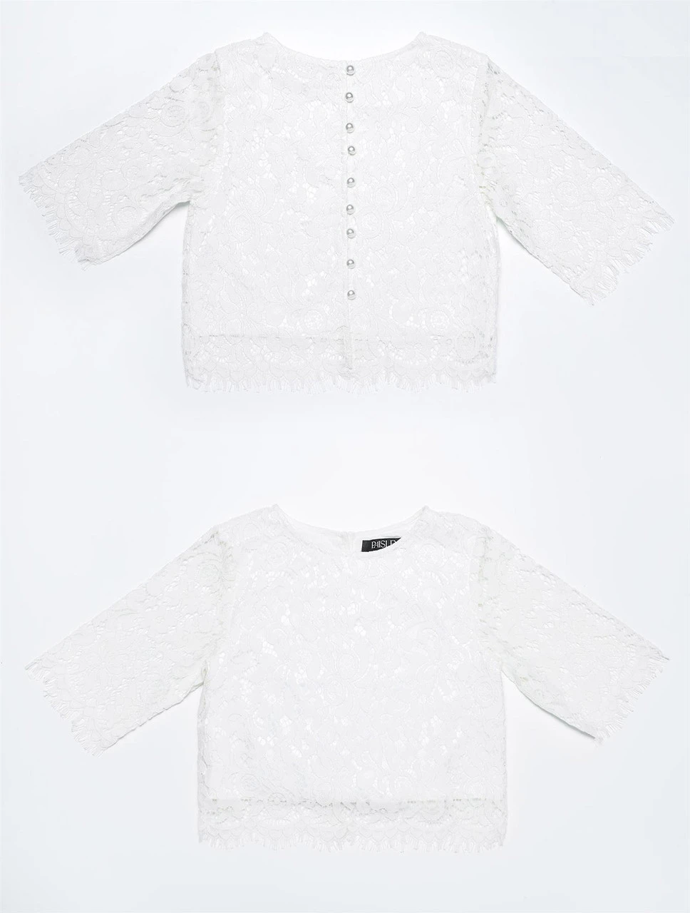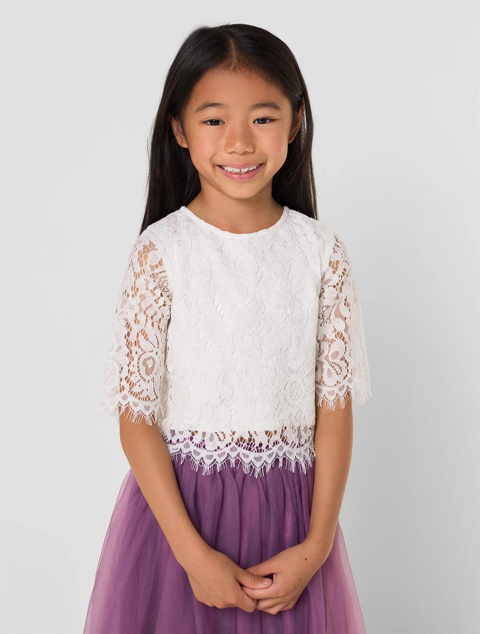Celebrate in style with this modern two-piece outfit. The eyelash lace top features a scallop edge detail, elbow length sleeves and fastens with functional pearl buttons and rouleau. Paired with a tulle pull on style midi length skirt and styled with Roco ballerina shoes, this makes the perfect flower girl or party outfit.