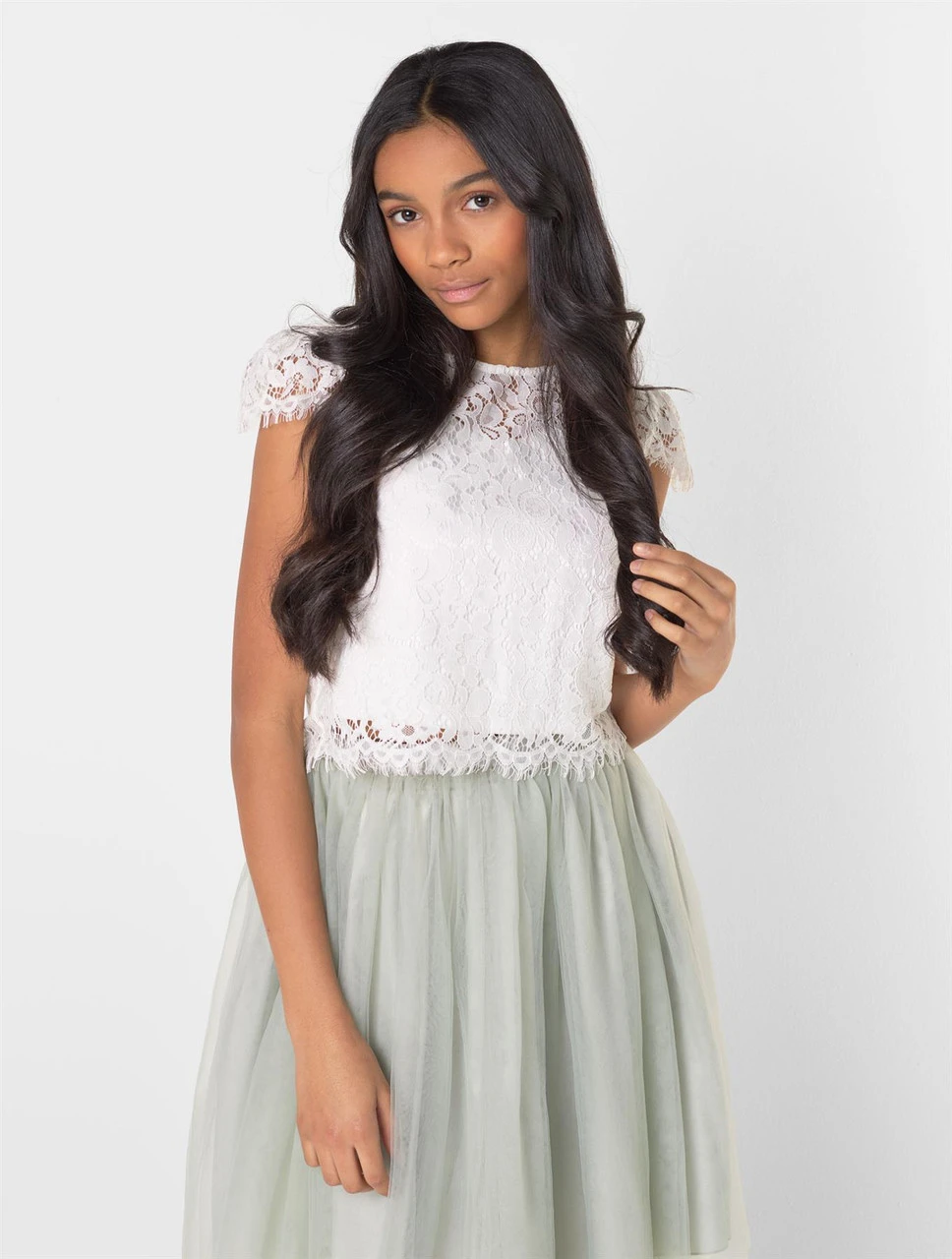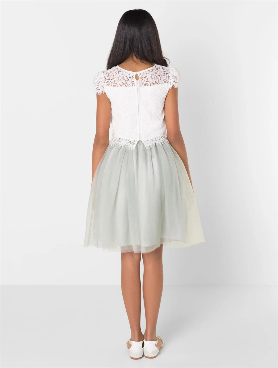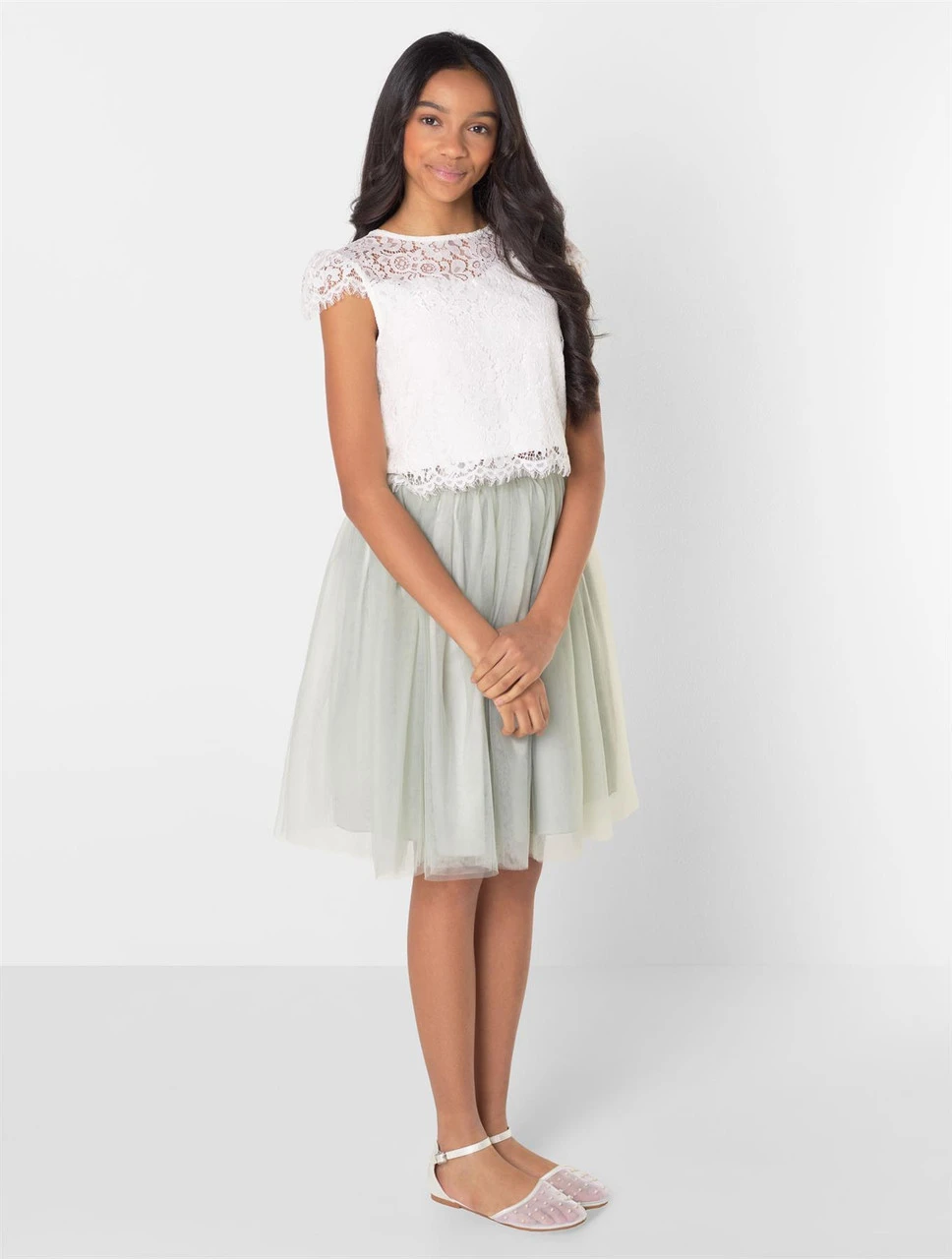 Celebrate in style with the Frances two-piece outfit; the dreamy lace top with sweetheart neckline and tulle skirt with sage green undertones makes the perfect flower girl or party outfit.
