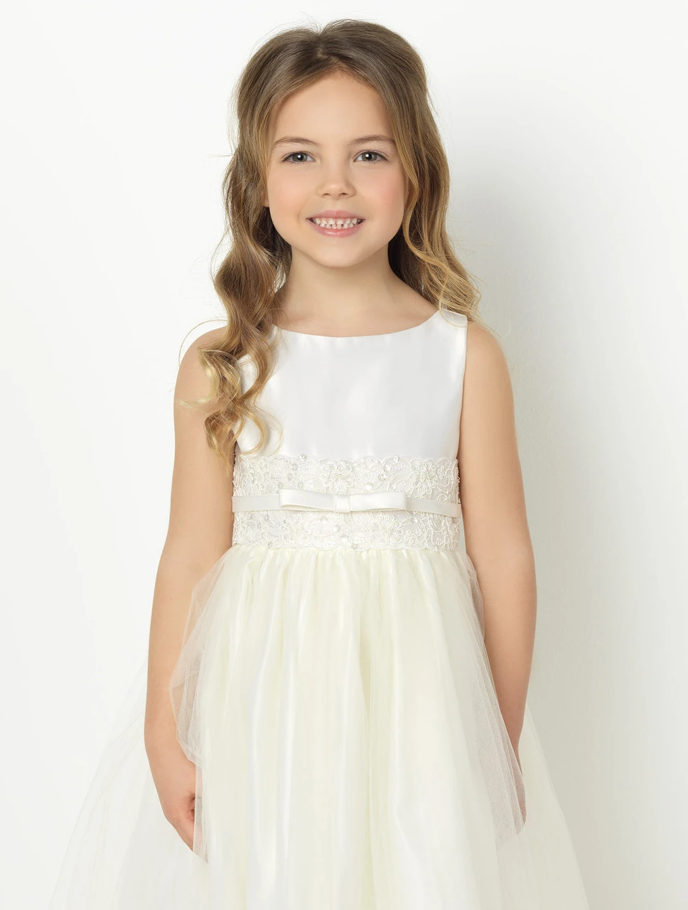 She’ll look the part at any special occasion in the Rosella dress. Designed by Sevva, the timeless style features ivory satin bodice with tulle skirt. Decorating the waistline, an intricate lace piece is embellished with thin belt and centre bow. This style makes an elegant choice for any event.