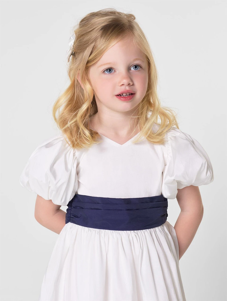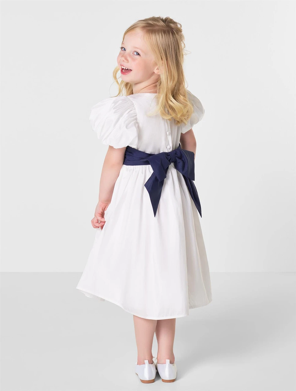 This taffeta ‘Prim’ dress will be the perfect piece for her special occasion. The dress features puff sleeve detailing with a contrast navy bow that will stay perfect all day long, along with easy button fastening at the back. A light weight cotton lining makes this dress super comfortable and lightweight.
