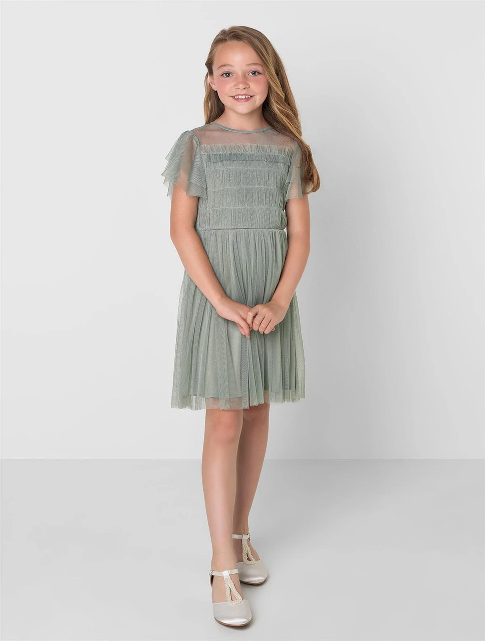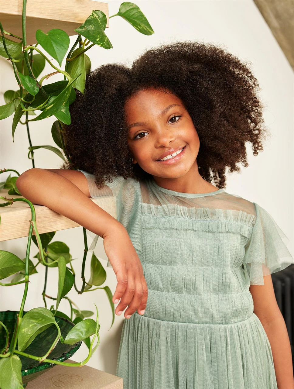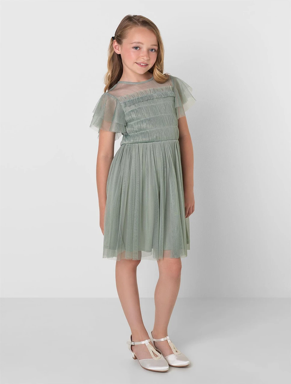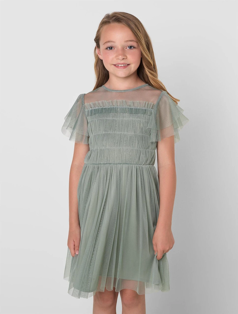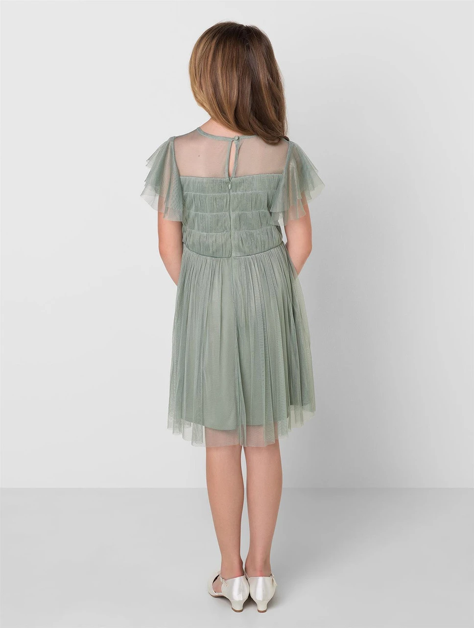 Tinkerbelle style tulle dress, with a cute semi sheer pleated bodice and floaty layered capped sleeve. Multi layered tulle skirt, fully lined. Back Zip and button fastener.