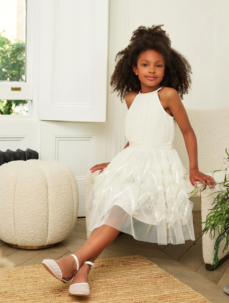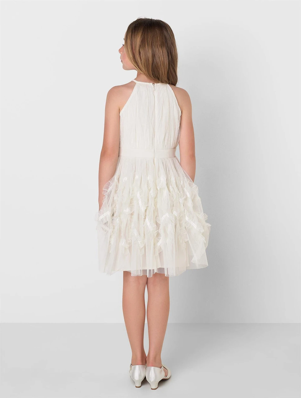 The Ivy is a delicate halter style ivory flower girls dress. A rouched tulle bodice paired with the multi layered pretty tulle skirt is perfect for every girls special occasion, zip back closure. Fully lined. Also available in frosted pink.