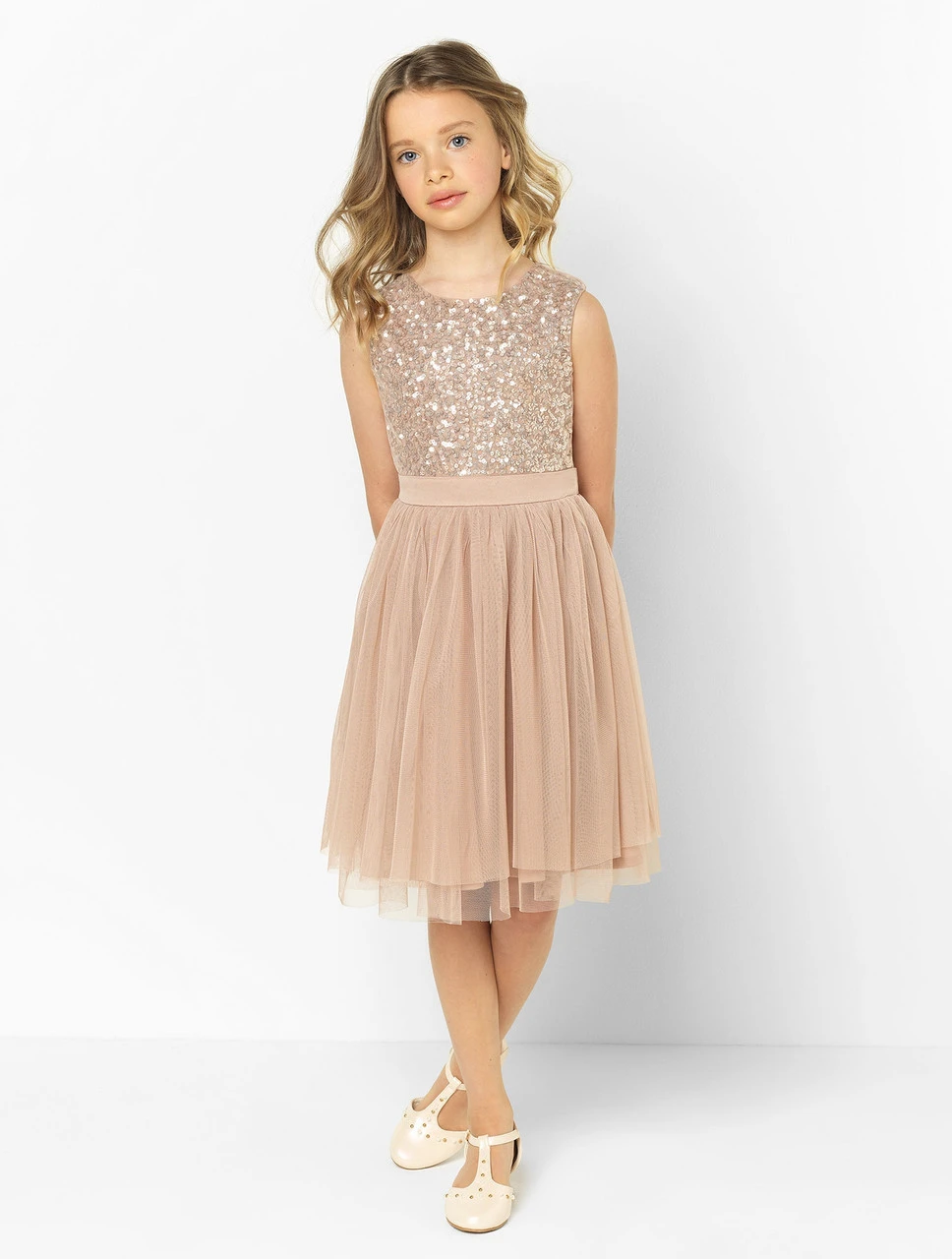 Whether she’s a birthday girl or flower girl, this dream dress is the perfect choice for those extra special occasions. Designed by British brand Maya, the expertly designed sequin dress has mesh covering to keep the bodice comfortable for little ladies! The coordinating tulle skirt in taupe blush adds the perfect volume to make this outfit a modern must-have!