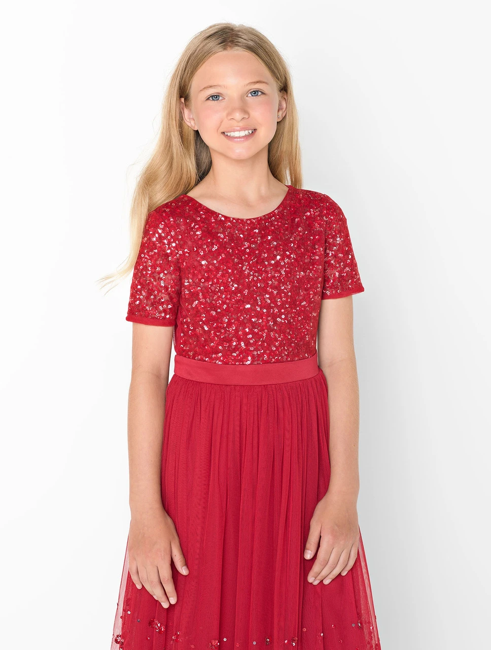 Designed by Maya, the Araya dress is a must-have for the party-season. Beautifully crafted, the sequin bodice has a mesh covering to keep them comfortable while they dazzle on the dancefloor. The coordinating tulle skirt in vibrant red is finished with intricate beadwork on the hemline. This perfect party piece will wow at any occasion.