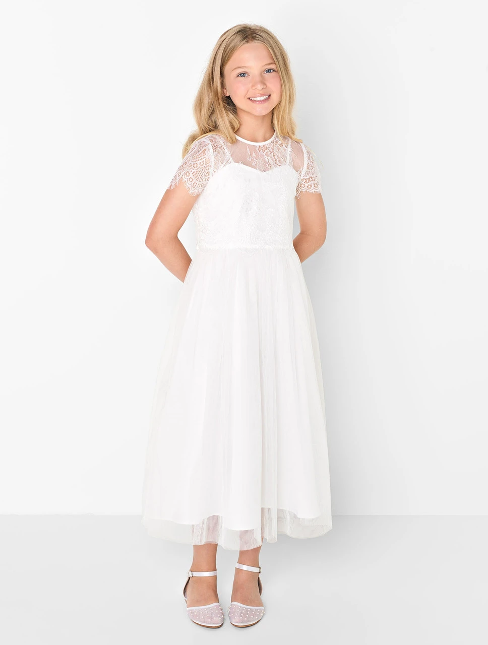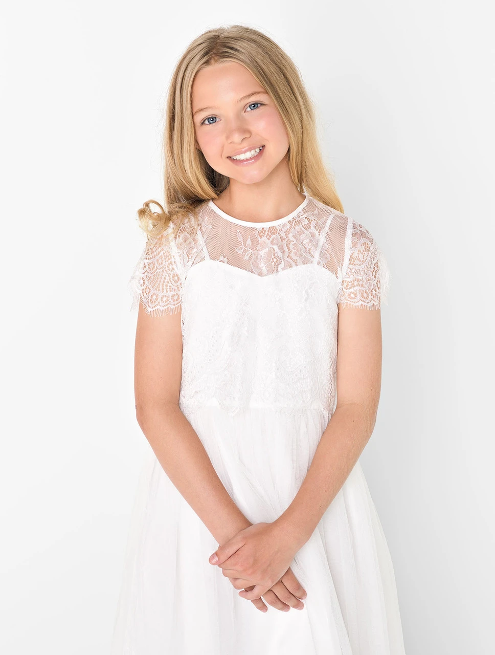 A picture in white, the Amara dress is made to stand out from the crown. The premium lace topper has an open back and is styled over a tulle dress with sweetheart neckline. Designed by Paisley of London, this dress is a lavish choice for her next special occasion.