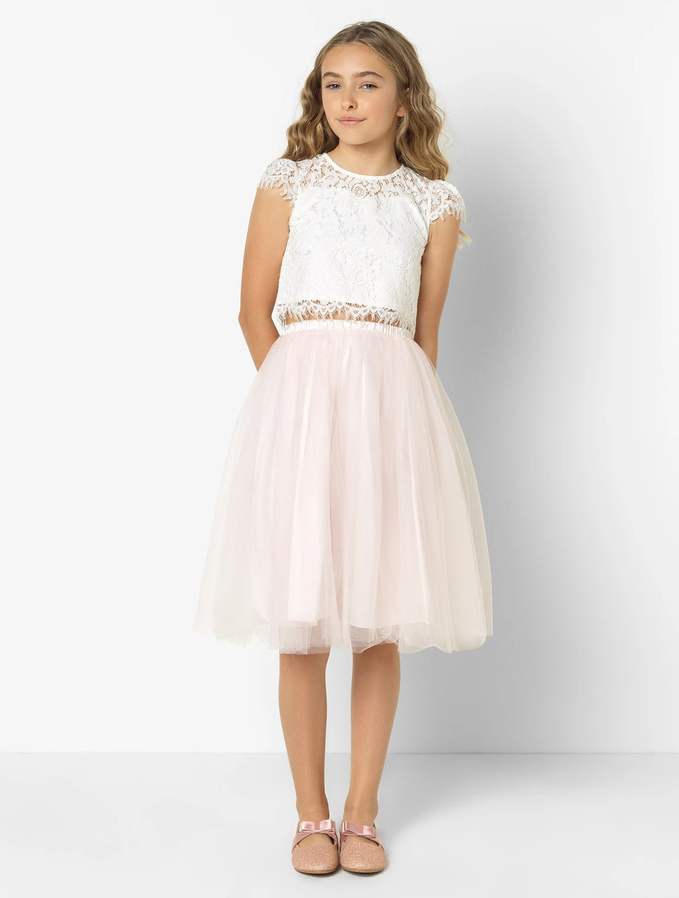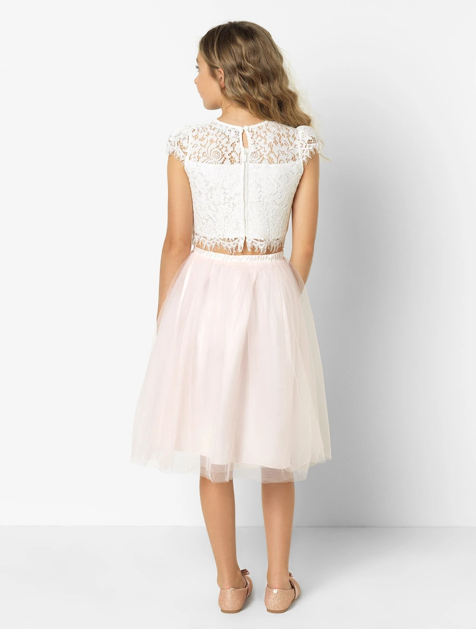 Celebrate in style with the Frances two-piece outfit; the dreamy lace top with sweetheart neckline and tulle skirt with blush undertones is a heavenly duo for your angel.