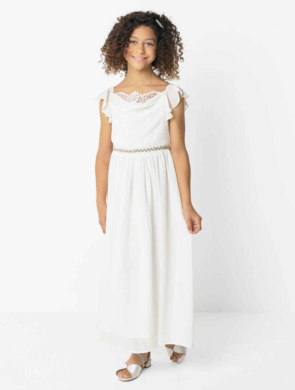 Designed by Paisley of London, the Eliza is a luxury look. The classic shape features subtle cowl neck front with lace insert at front and back. Adding just a hint of glam, a delicate belt featuring alternate diamantes and pearls decorates the waistline. The beautiful design makes this a dream dress for her Holy Communion or junior bridesmaid duties.