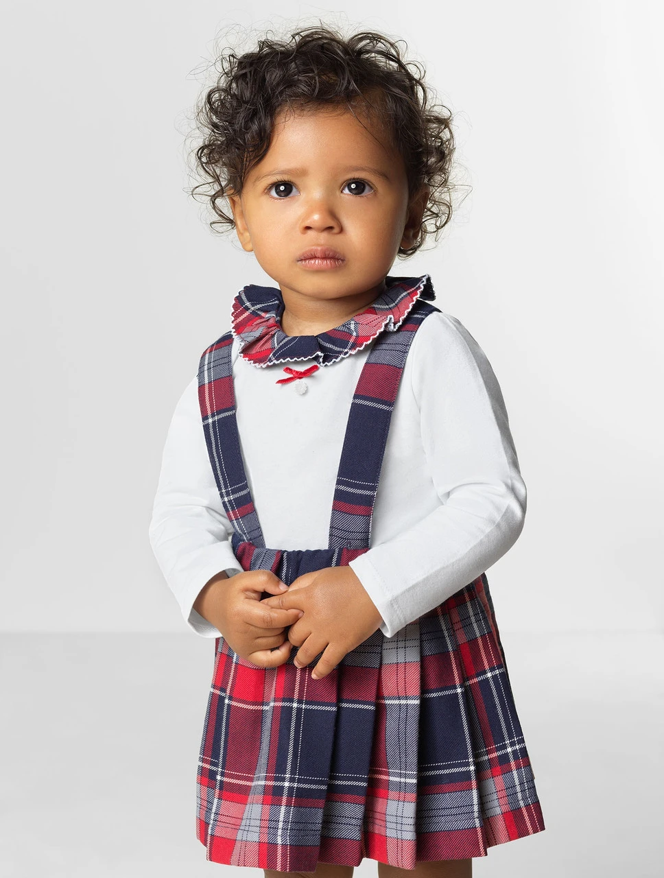 Micaela by Patachou is the perfect outfit for your little bundle of joy. Ideal for parties and other special occasions, the pinafore and top set are designed with a custom made tartan print. The classic pinafore is worn over matching babygrow with ruffle collar and embroidery detail.