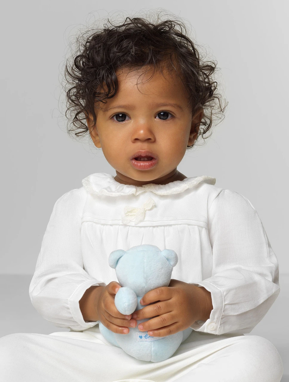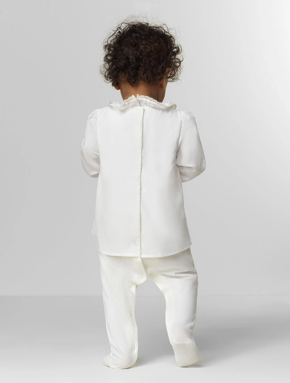 With its stunning antique details and exquisite fabrication, this beautiful babygrow combines comfort with style for luxury wear for that extra special occasion. With a blouse-style top, the long-sleeved design has horizontal pin tucks and sweet detailing that complements the lace lined peter pan collar and centre lace bow. The babygrow silhouette provides comfort and full coverage for an oh-so-adorable look for your little darling.