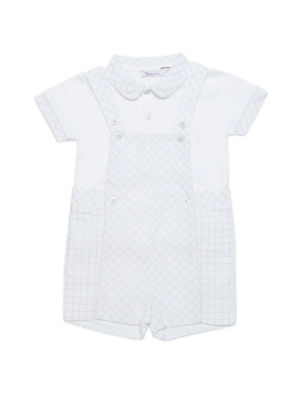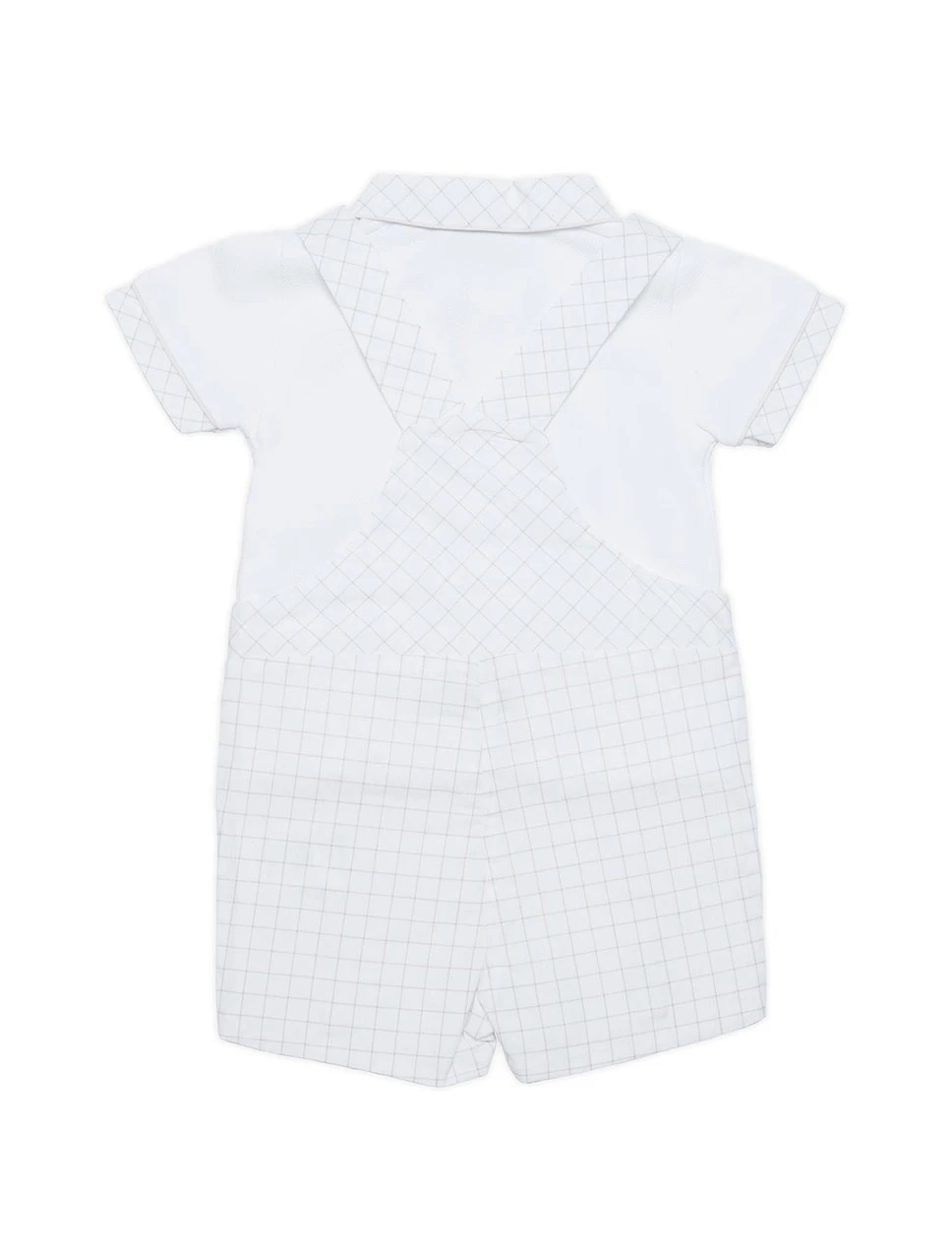 Perfect for summer. crisp white dungaree set with subtle grey check details, button bib and waistband design. Matching white polo super soft with short sleeves and buttoned neckline finished with a cute little checked collar. Machine washable.