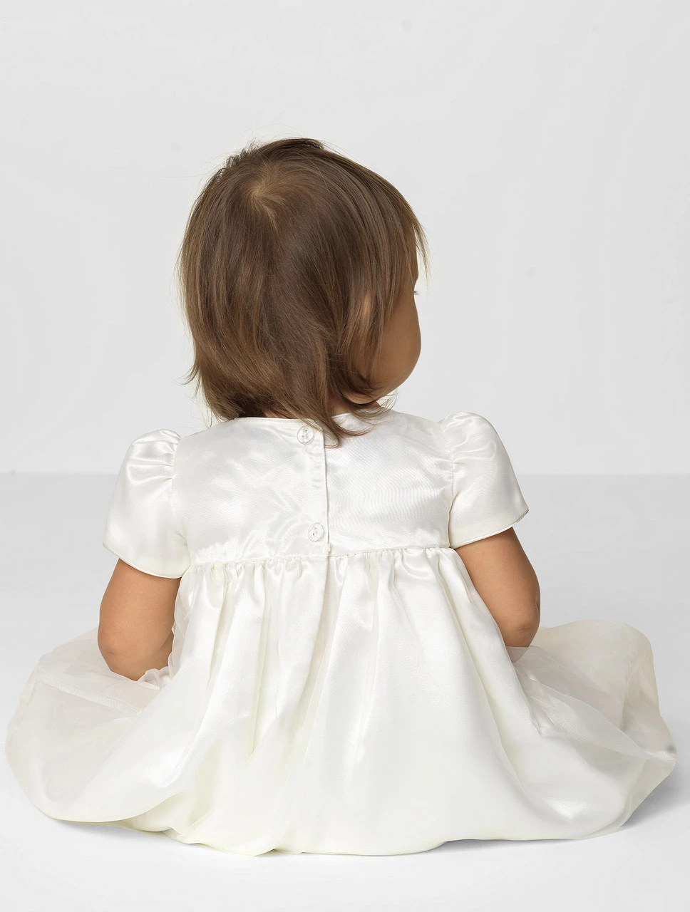 The Ferne dress is sweet addition to our baby girls’ dress range, by Peppermint Phoenix. This short sleeved dress is derived from a silky soft fabric designed with sensitive young skin in mind. The bodice is studded with pearls and horizontal stitching to add texture. The dress is a beautifully layered tulle, making for a graceful image with the matching bonnet.