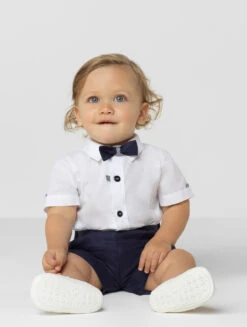 Dressing like a gentleman can start as young as three months, with the Augustin romper. The adorable outfit features cotton shirt, fastening at the front with navy buttons and tab detailing on the sleeve. Styled with navy linen shorts, the design has front pleats and half-elasticated waistband. Finishing the look, the coordinating bow tie adds a dapper touch, making your toddler party ready for any event!