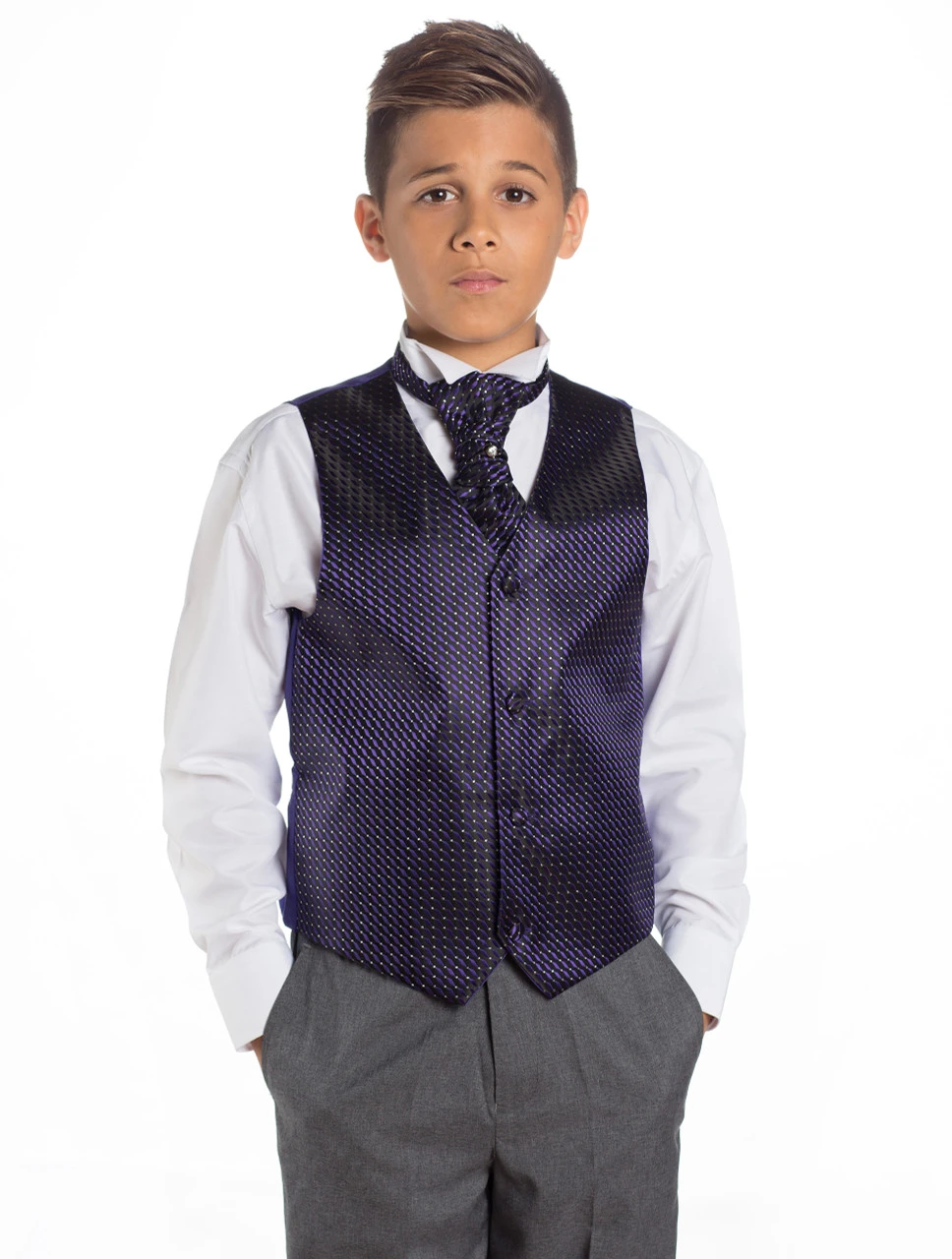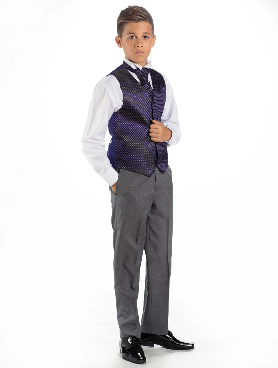 This fashionable 4 piece purple & grey waistcoat suit expresses a prominent impression for page boys. Brand new and exclusive from Paisley of London it is meaningfully designed with careful attention to detail using comfortable and flexible fabrics. The stunning on trend pattern waistcoat and matching cravat are elegantly complemented by the included straight bottom grey trousers and white wing collar shirt.