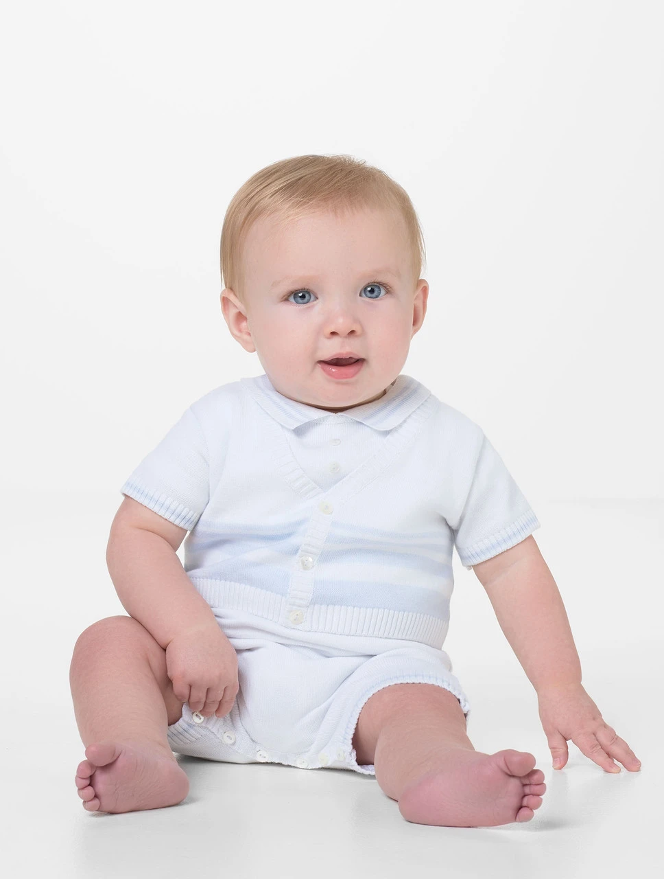 This precious look is the perfect choice for any special occasion dressing. The soft knit design features short sleeved cardigan with accents of blue and coordinating romper. Occasion dressing has never been easier; with buttons at the legs for extra easy changing throughout the special day. Designed by Sarah Louise, the brand is renowned for their timeless pieces that make the perfect keepsakes.