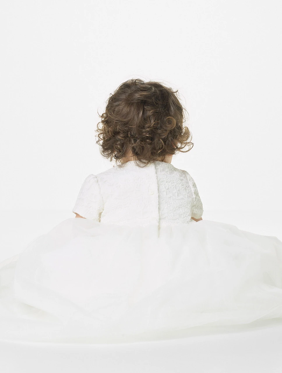 Beautifully designed by Sarah Louise, the Miriam is a luxury ceremonial gown. The decorated bodice has short sleeves and waistband with rose applique. Complete with full length skirt with satin trim the Miriam is a true heirloom piece. The matching hat completes the look for her picture perfect celebration.