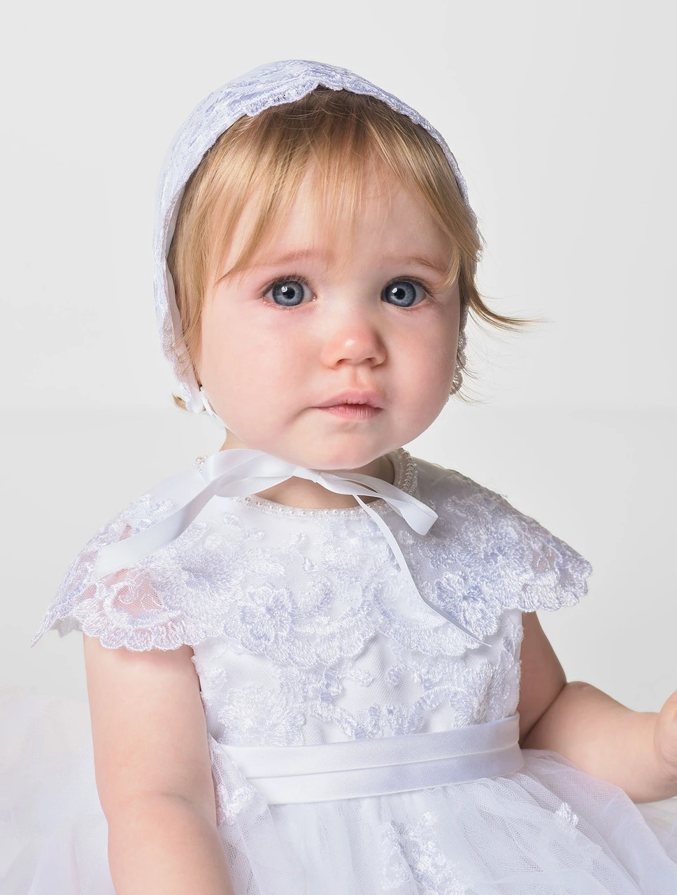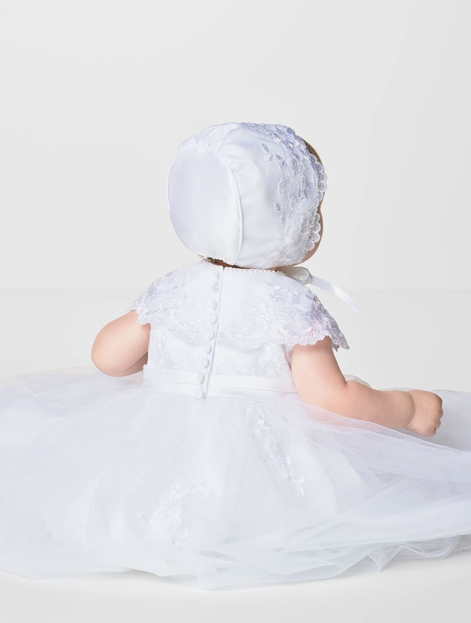 Featuring a sweet cape collar, the floral lace Christening gown by Sarah Louise is an heirloom occasion dress. Intricate beadwork decorates the collar, with scallop detail combining contemporary detail with a traditional silhouette and oversized skirt. She’ll be picture perfect for her special occasion in the white Angela gown.