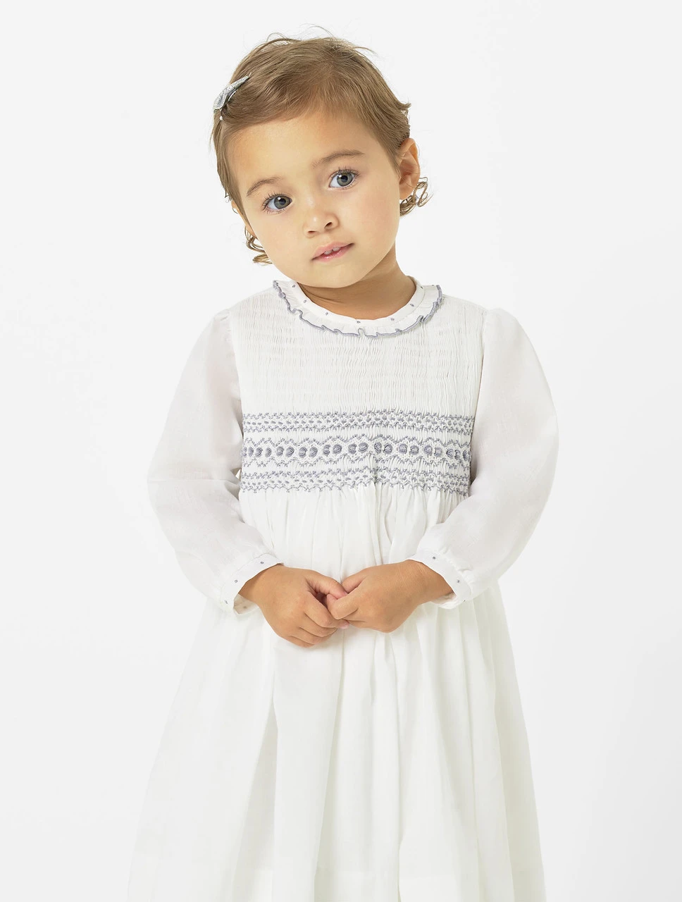 Exclusively designed by Sarah Louise for Roco, the Lucy dress has a traditional design with icy grey accents. The iconic smocking design complements the modern polka dot accepts on collar and cuffs. The long sleeved cotton dress keeps comfort key in an outfit that ticks all the occasion wear boxes.