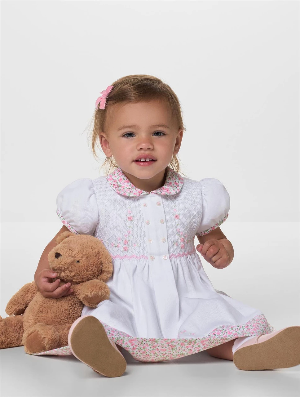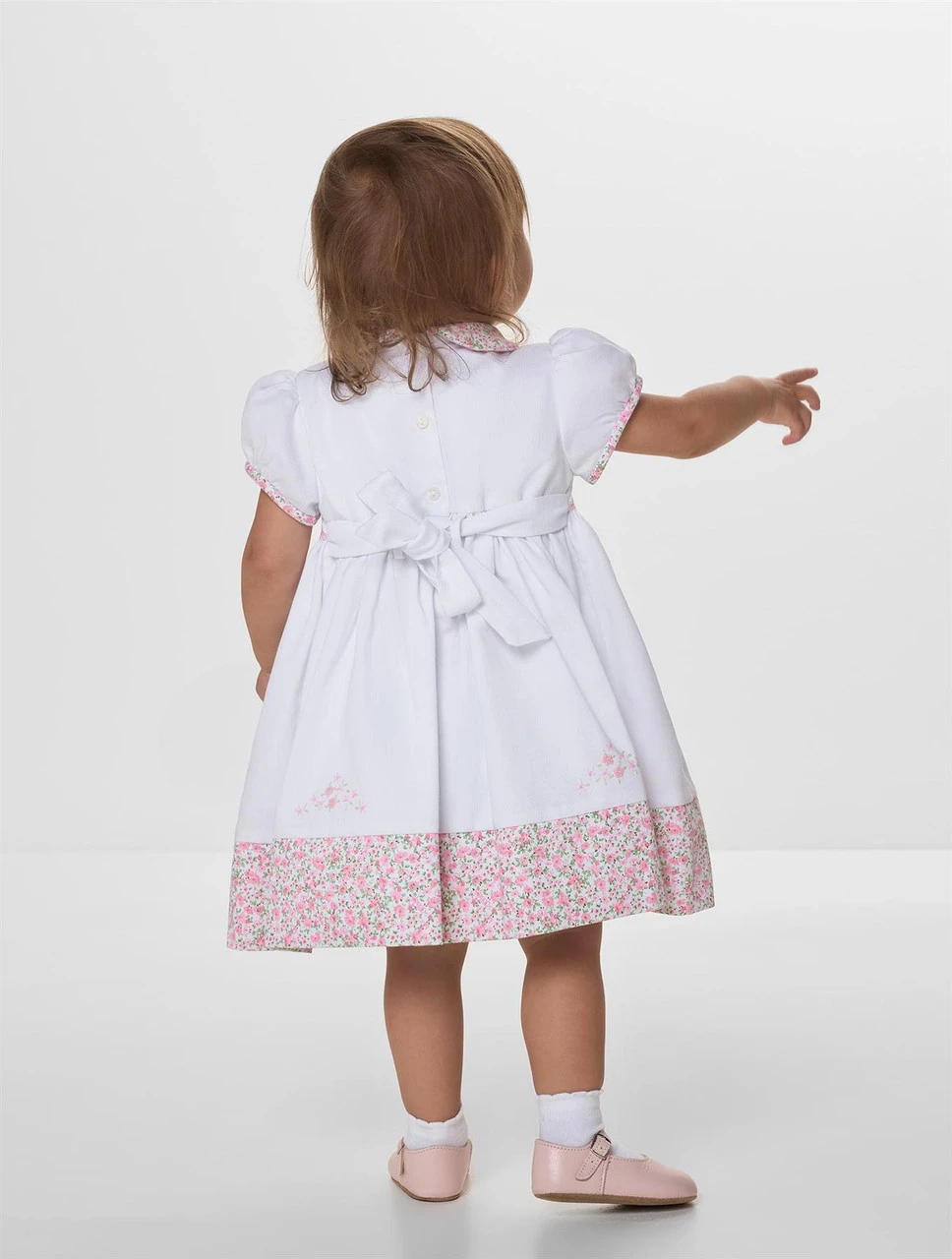 A classic white and pink floral dress for girls by Sarah Louise, made in a soft polycotton. Fully lined, it has a hand-smocked panel on the front with hand-embroidered pink flowers. Liberty style floral Peter Pan collar and matching trimmed hem. Button fastening and sash tie on the back.