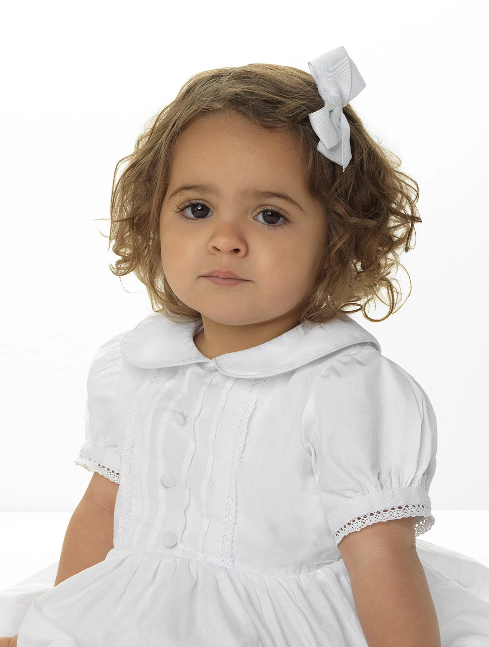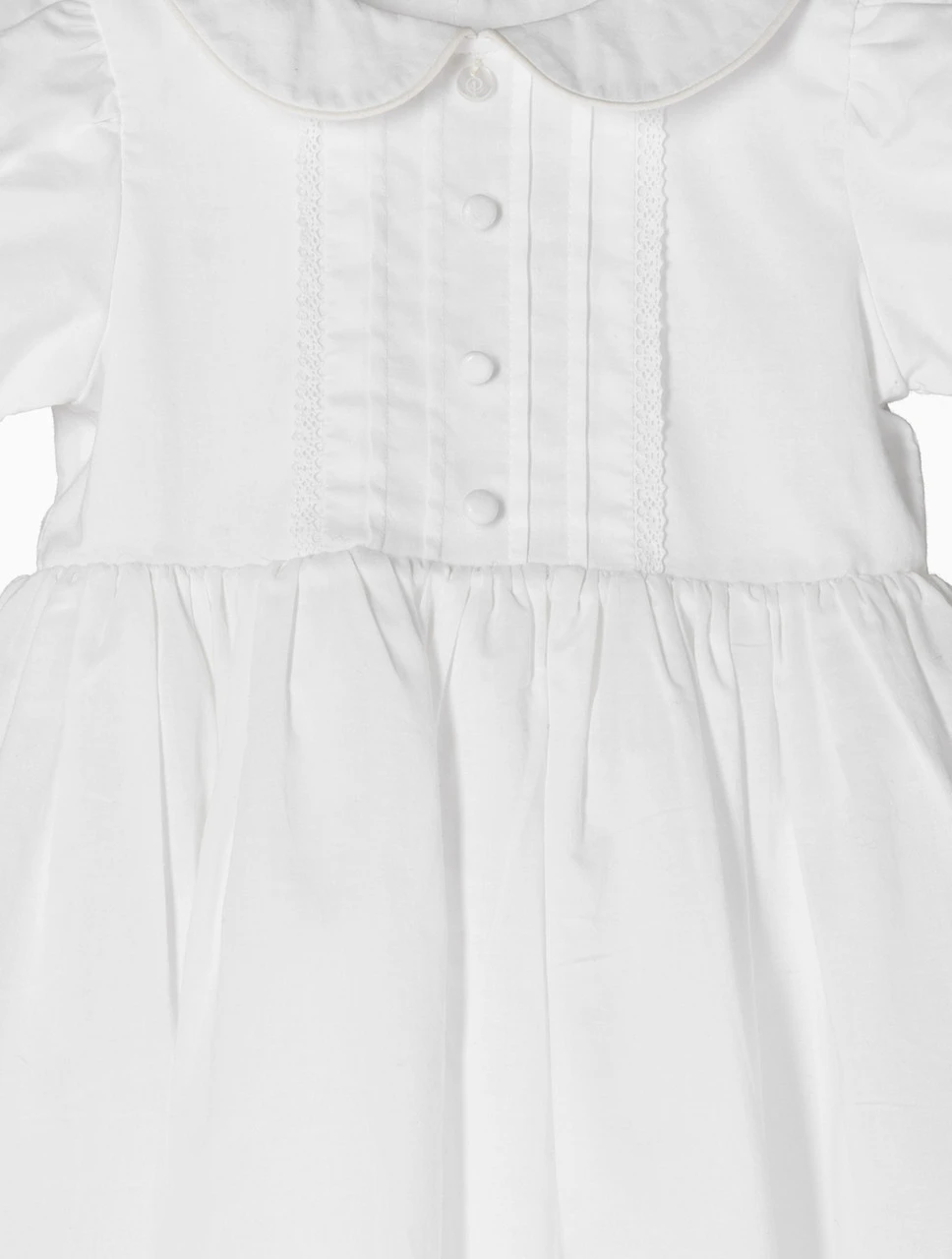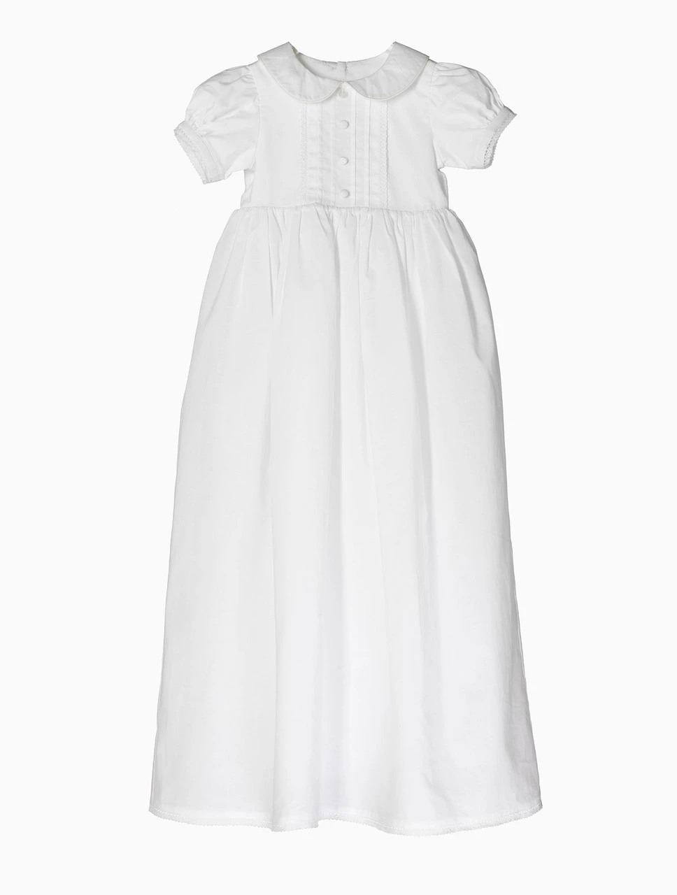 Your little angel’s christening will be all the more special thanks to the Ellen dress. Crafted from 100% cotton and fully lined, this gown is a modern take on a traditional silhouette. The classic lace trim is a subtle detail that adds delicacy to the peter pan collar and pintuck bodice detailing. With faux covered buttons at the front, the top neck features the ‘Pure’ pearl emblem, a unique touch for the exclusive ceremony pieces.